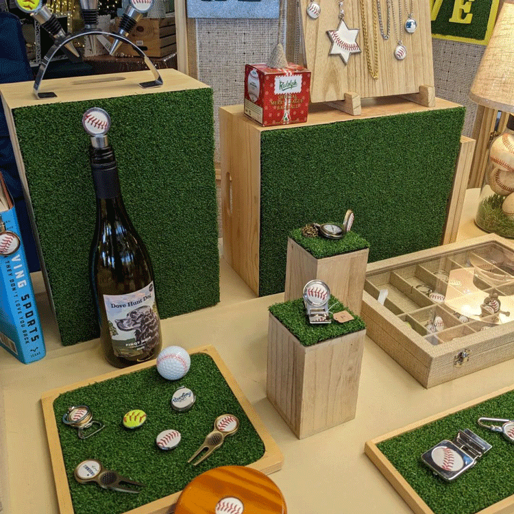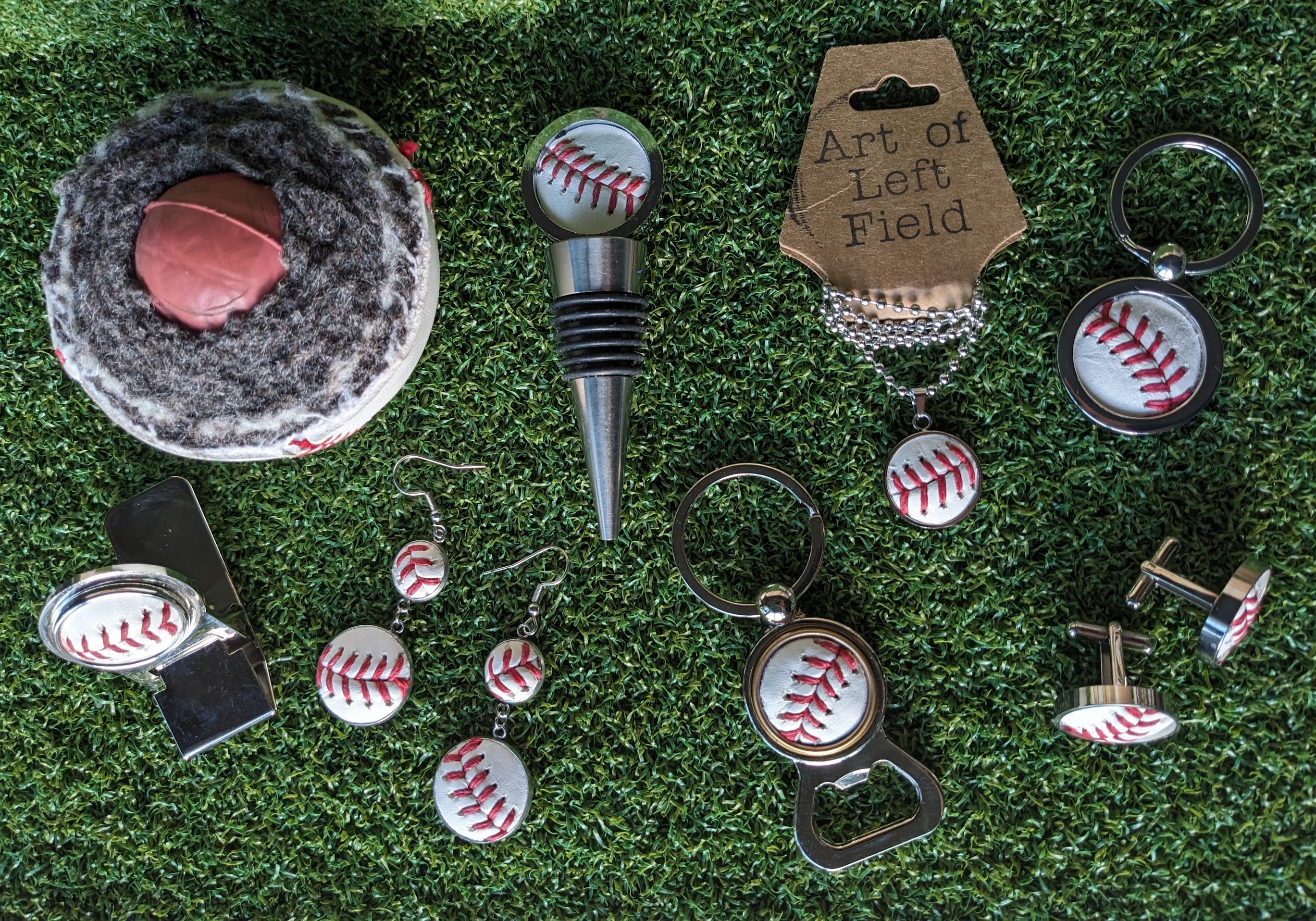 Jewelry featuring leather cut from baseballs and baseball gloves.