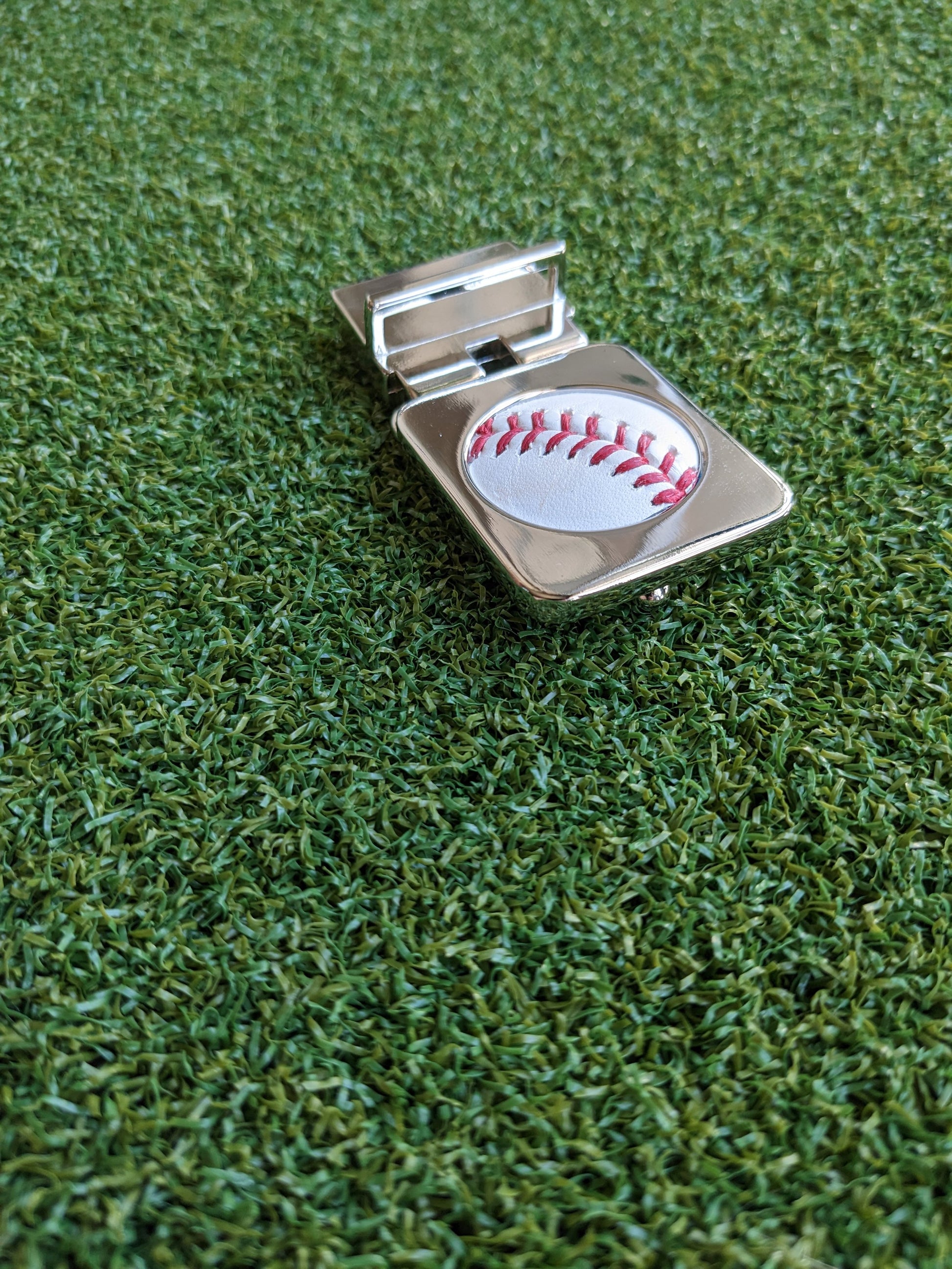This nickel plated belt buckle features a 1 1/4” circle of leather cut from an Official Major League Baseball. The buckle measures 1 1/2” x 1 3/4” and can be used with a belt up to 1 1/8”.