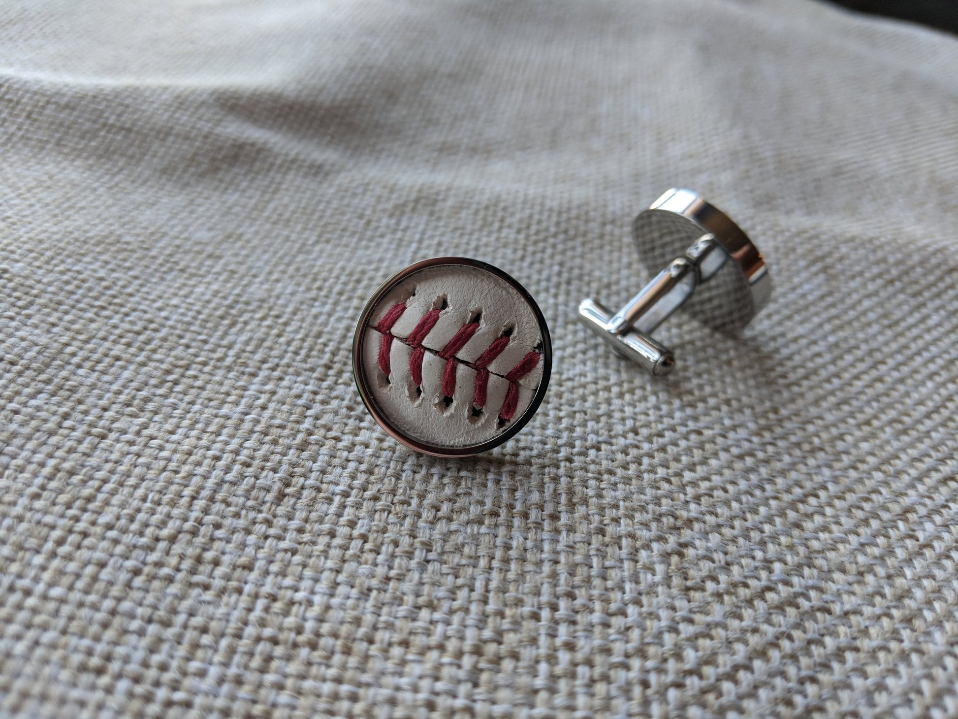 These stainless steel cuff links are inset with a 13/16" (20mm) circle of leather from a real Rawlings Official Major League Baseball. Each features an open front side so you can feel the leather and stitches.