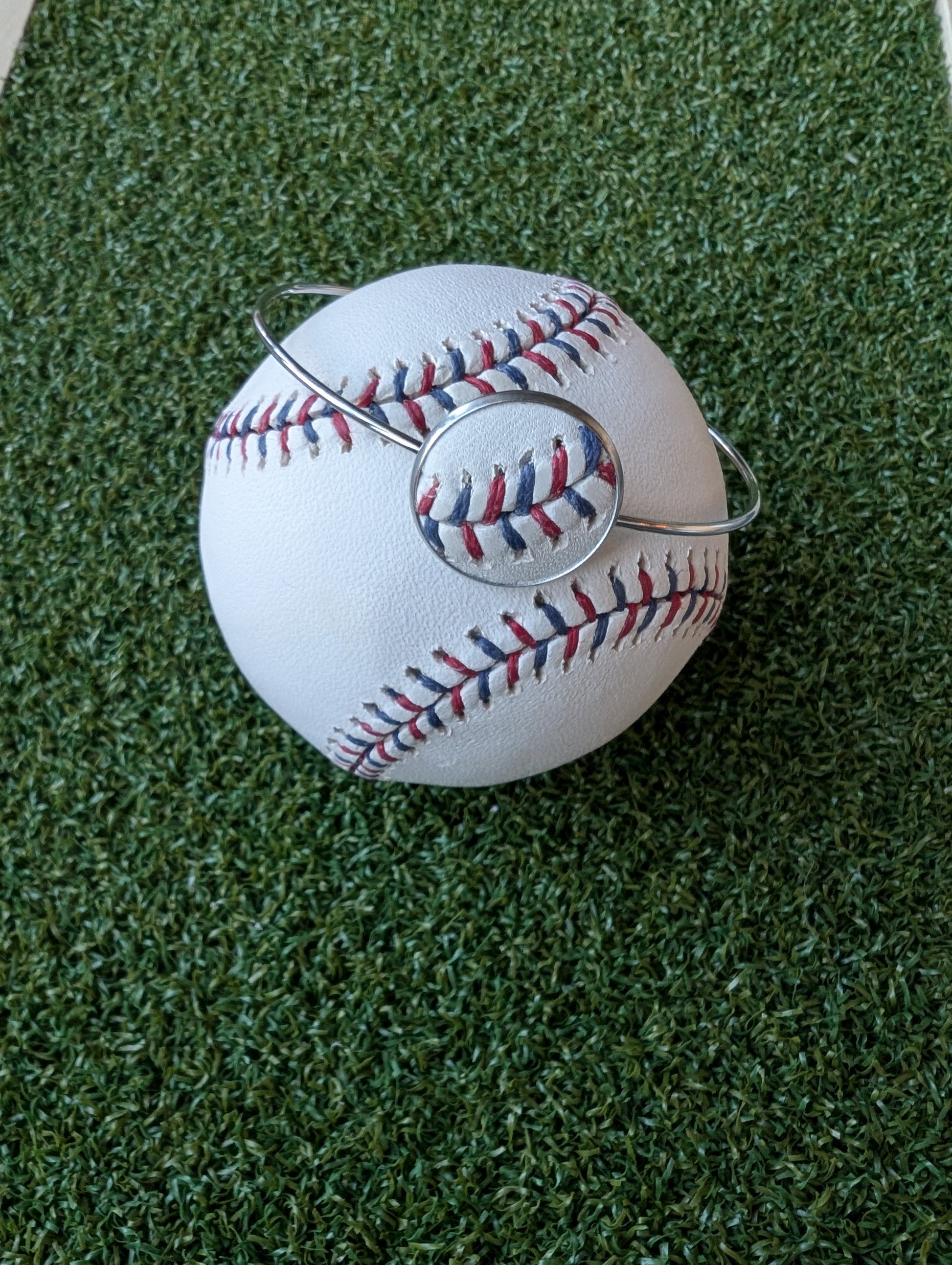 This stainless steel bracelet features a 20mm circle of leather cut from an Official Major League Baseball. The wire bangle style bracelet can be made larger to get it over your hand and the weight of the double loops helps the baseball stay on top of your wrist instead of always facing down. it looks great alone or stacked with other bracelets.