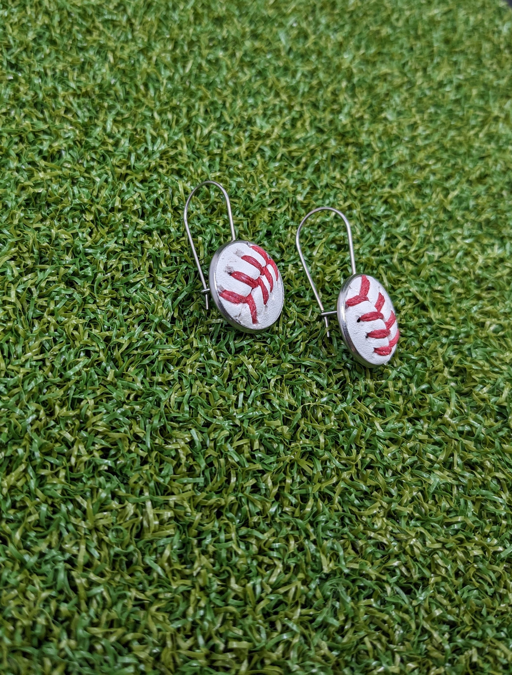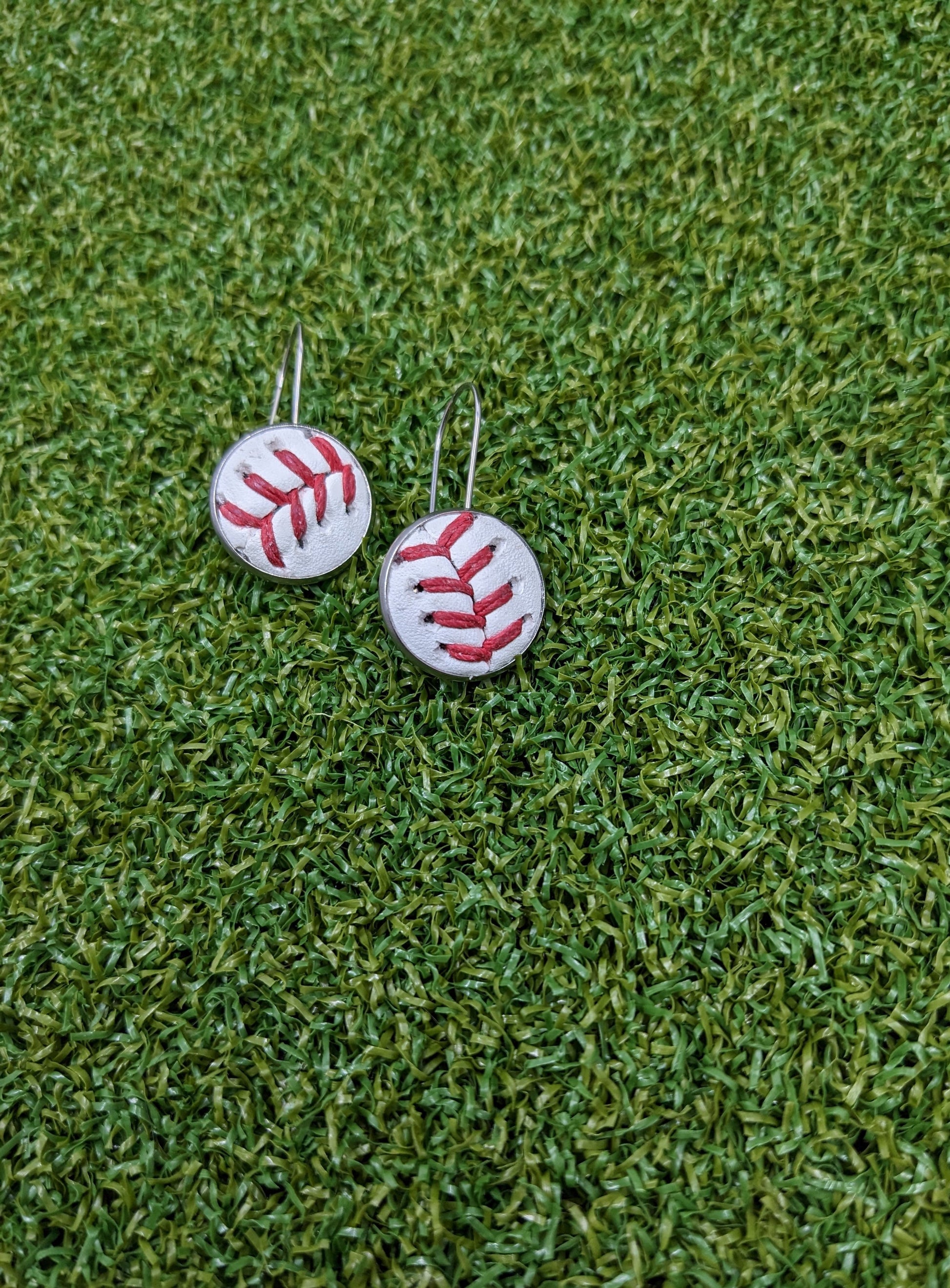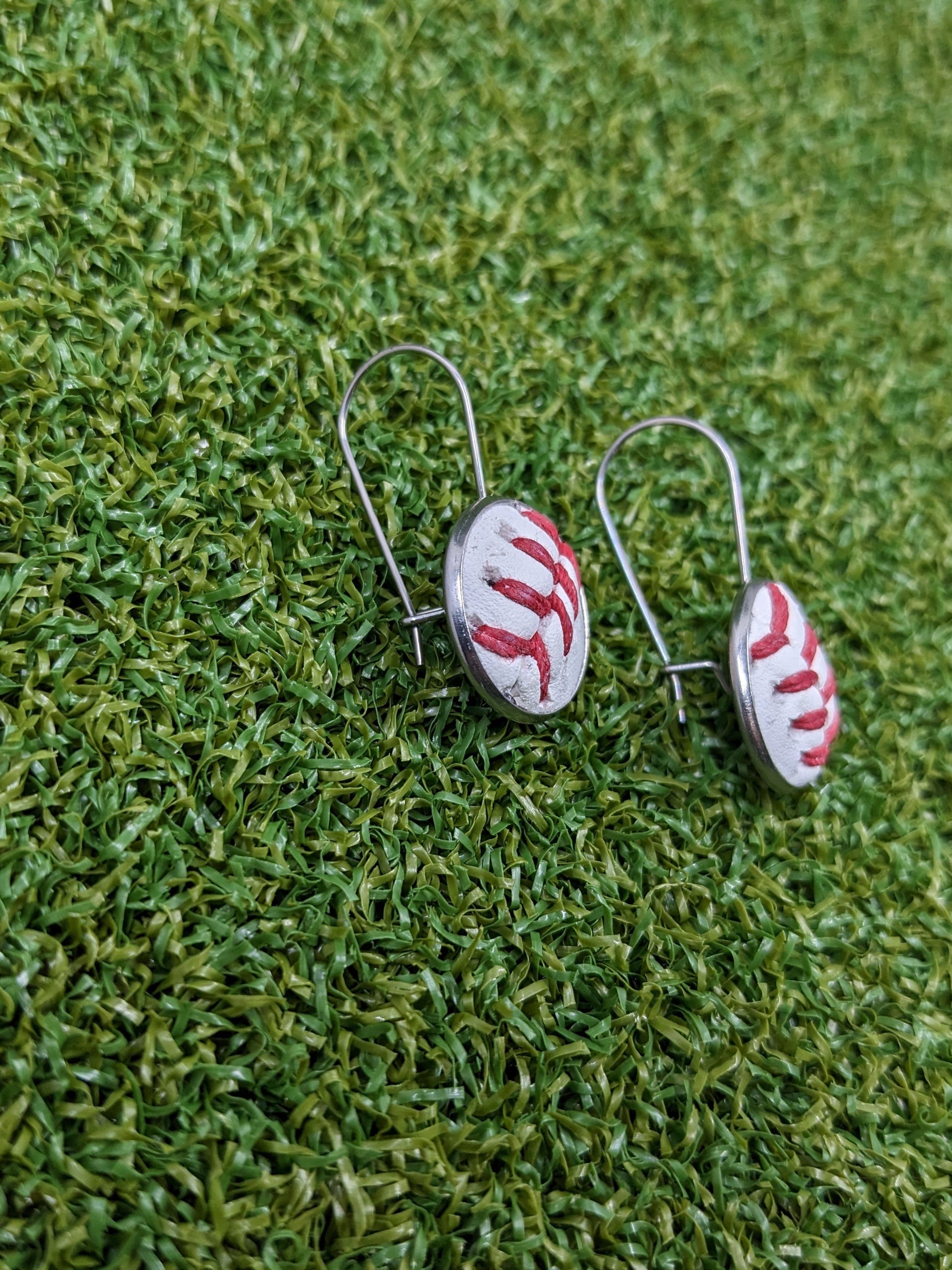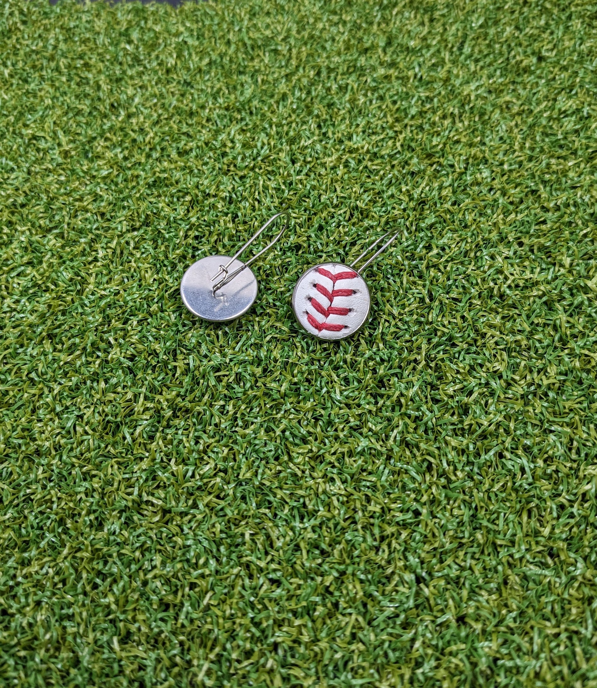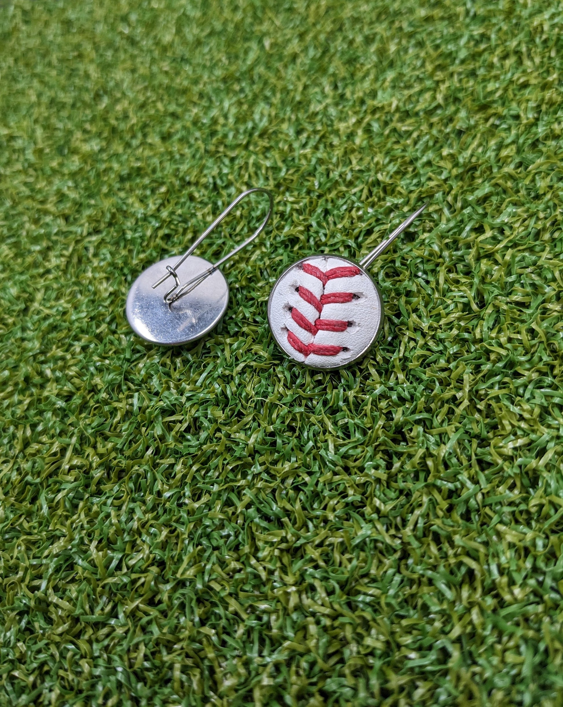 These earrings are perfect for any baseball fan! The 5/8” circles are made with leather cut from Rawlings Official Major League Baseballs. Each features an open front side so you can feel the leather and is connected to a stainless steel, kidney style ear wire. These earrings are extremely light weight, making them comfortable enough to wear through the whole day, to the game, and late into the night!