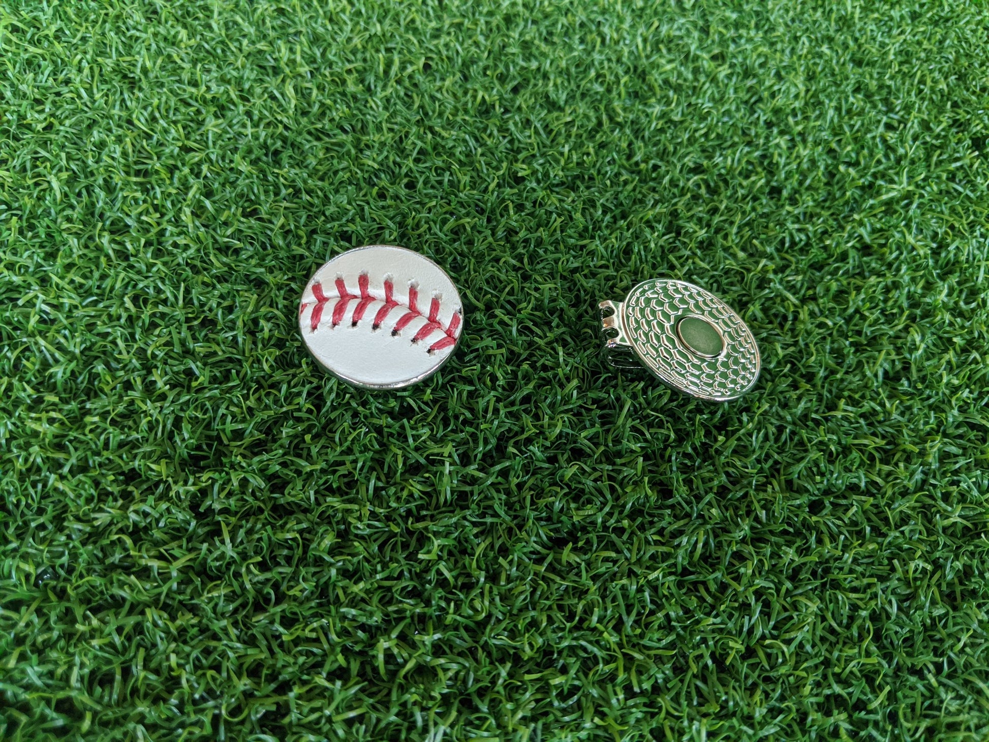 This magnetic golf ball marker features a 1" circle of leather cut from an Official Major League Baseball and a flat metal back. When you're not using it, the strong magnet in the hat clip allows you to easily clip the ball marker on to your hat, or belt, or shirt...