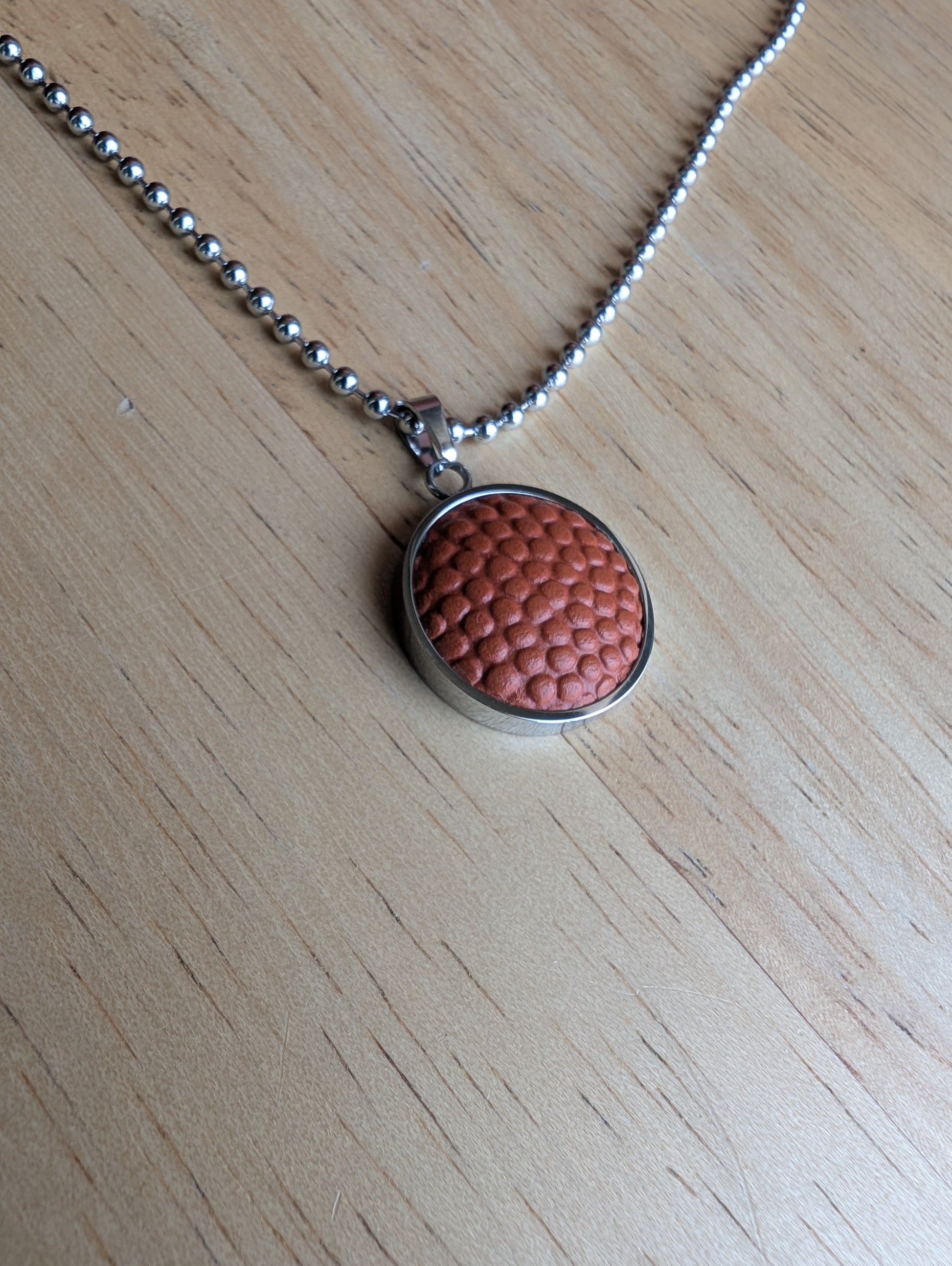 The 3/4" round stainless steel pendants are made with leather cut from real basketball leather. Each features an open front side so you can feel the leather and a solid metal back. The necklace includes your choice of 18", 20”, 22" or 24" ball (dog tag) chain.