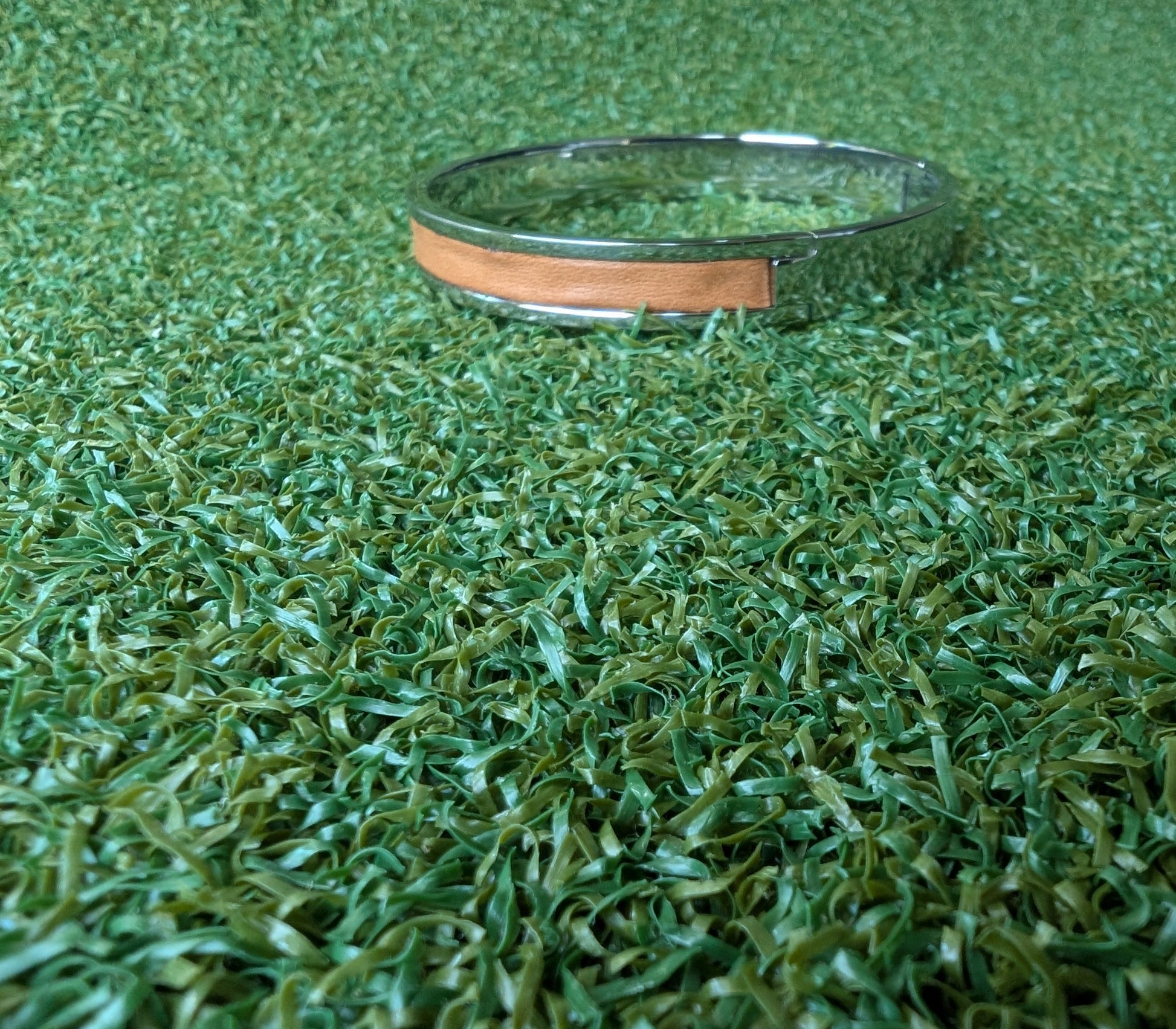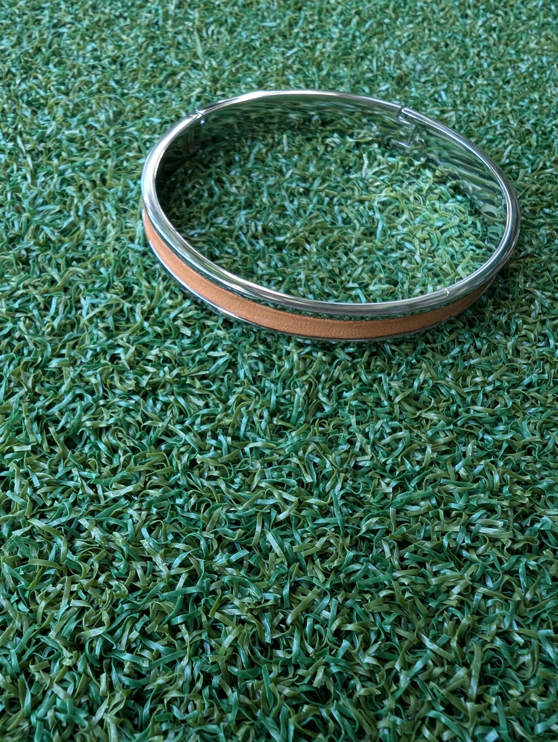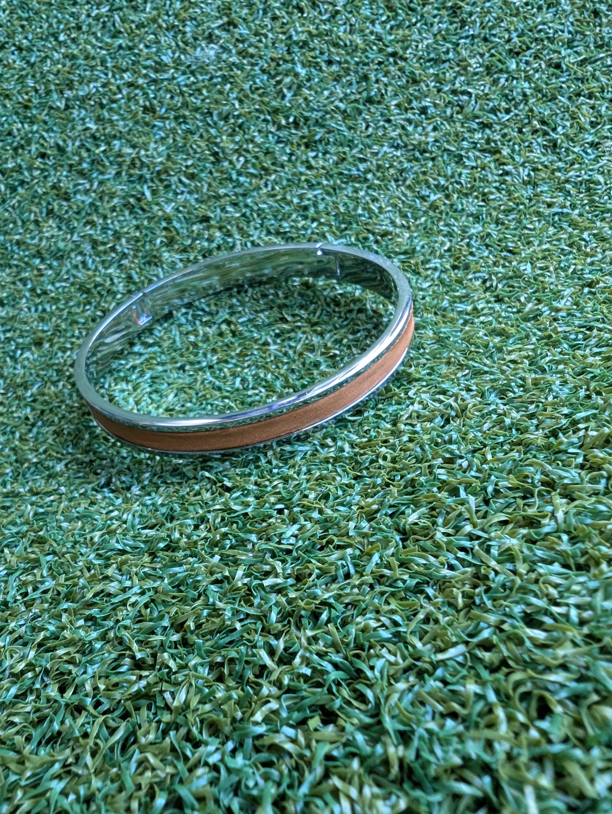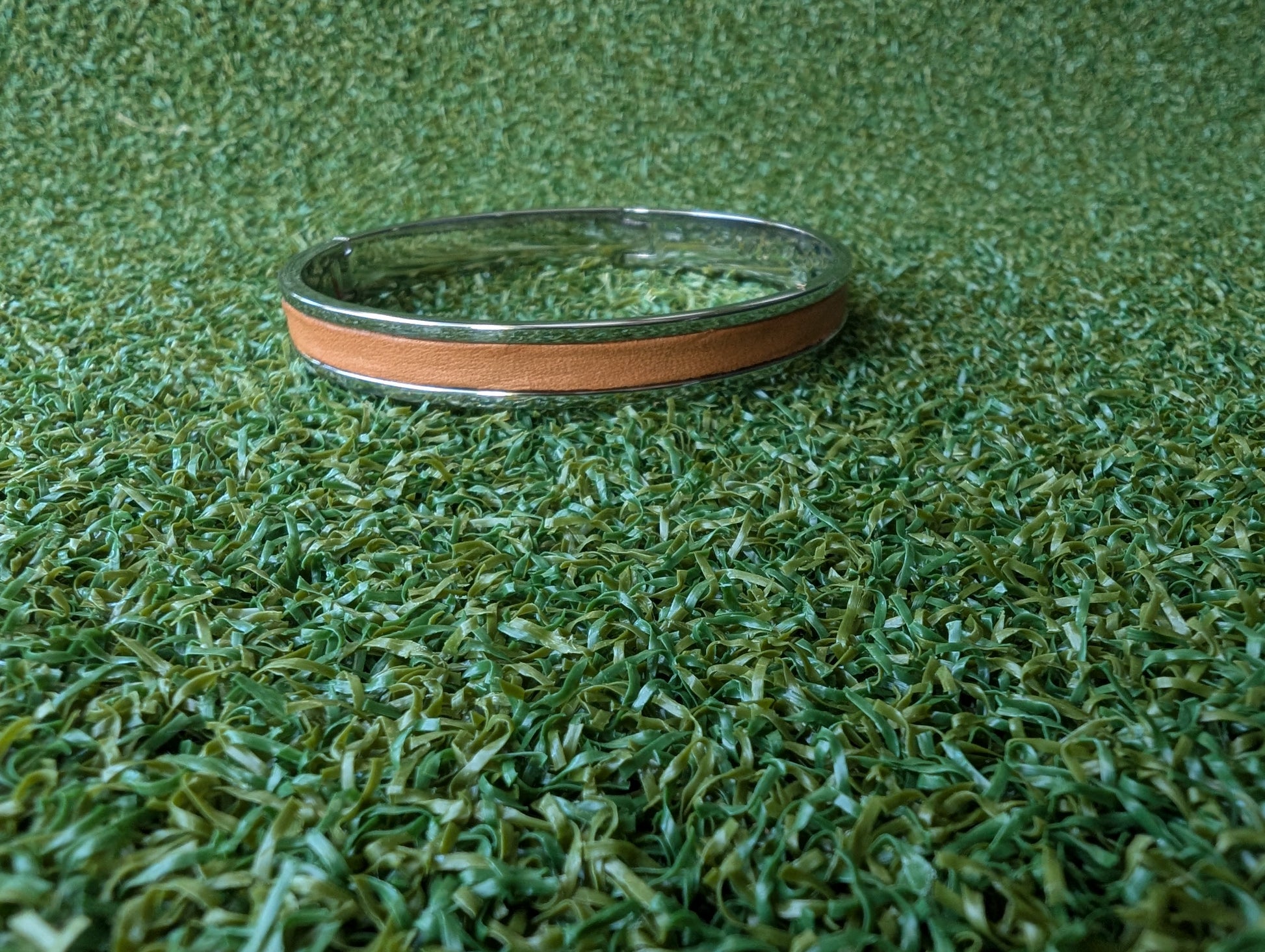This stainless steel cuff bracelet features and inlay of real baseball glove leather 3/4 around and has a latch clasp. The oval cuff measures about 2.5" x 2.25"