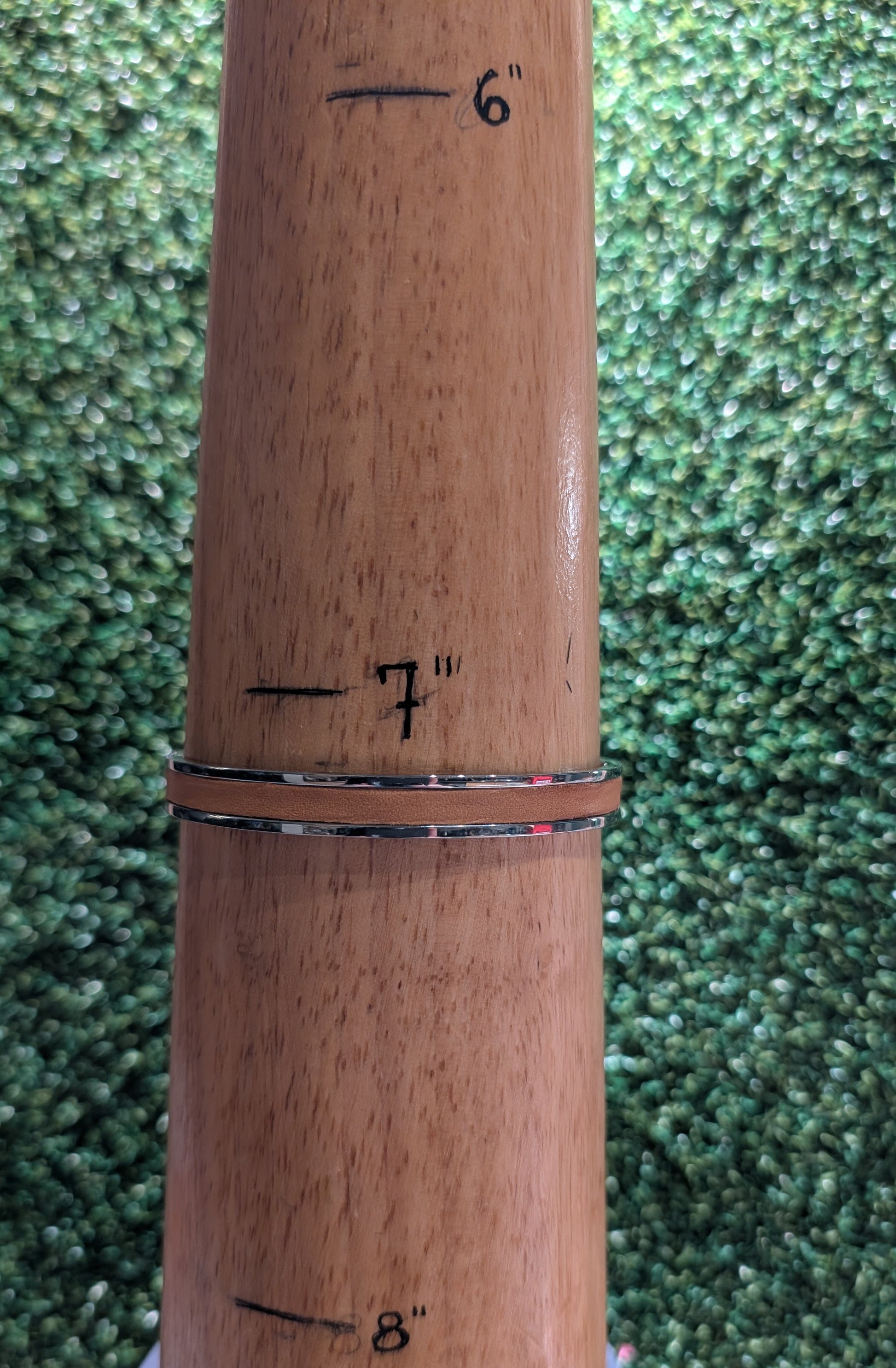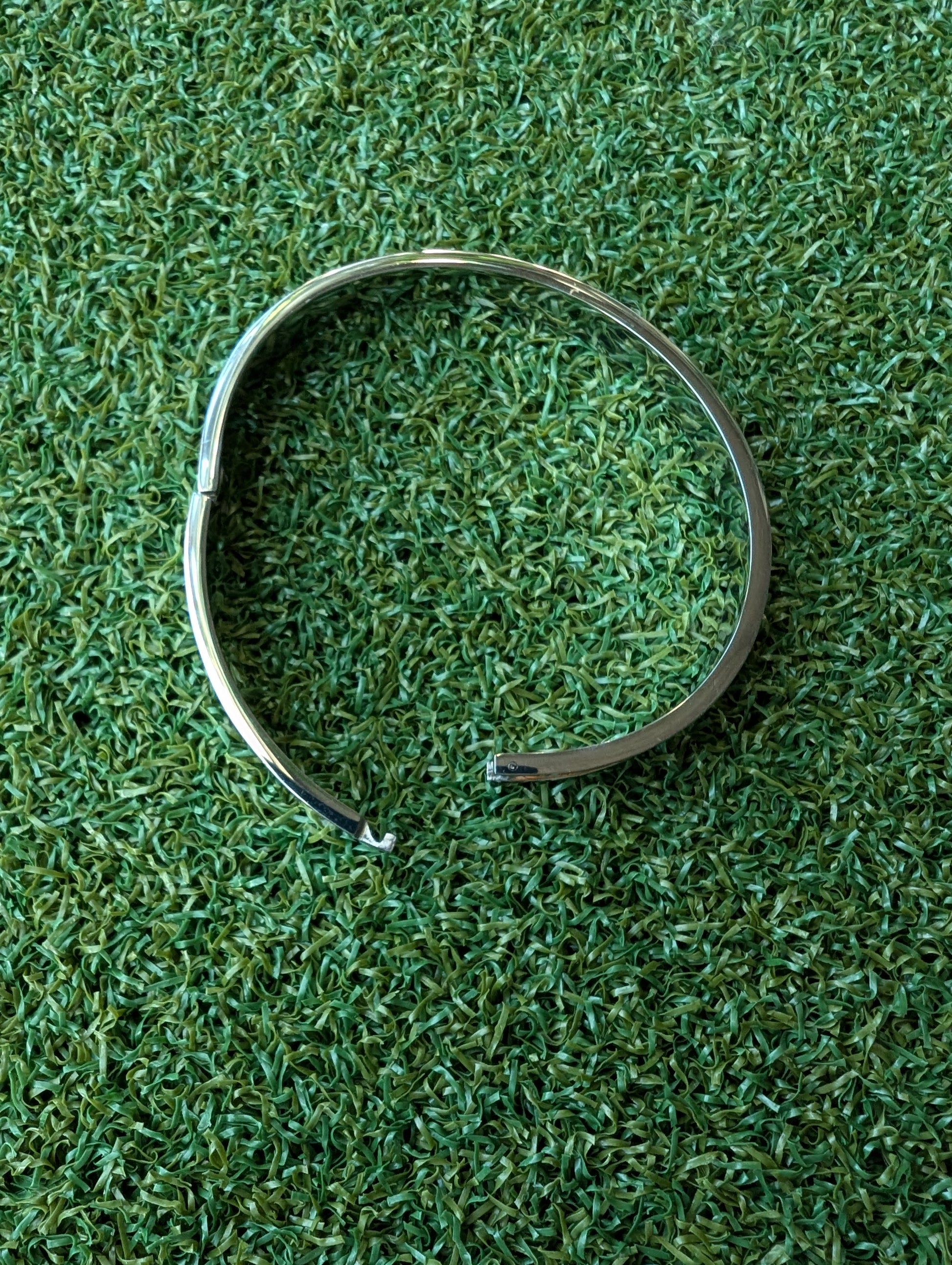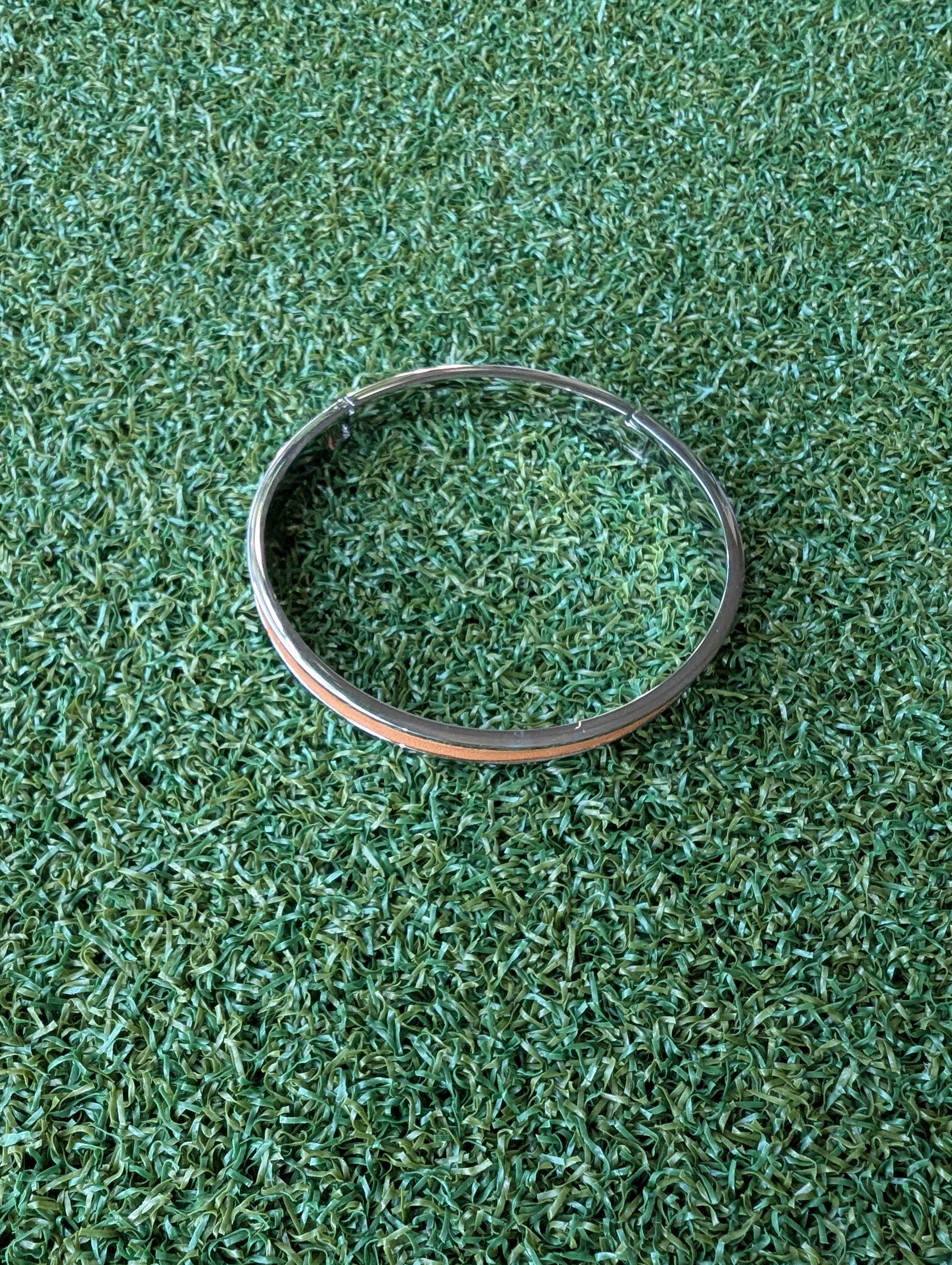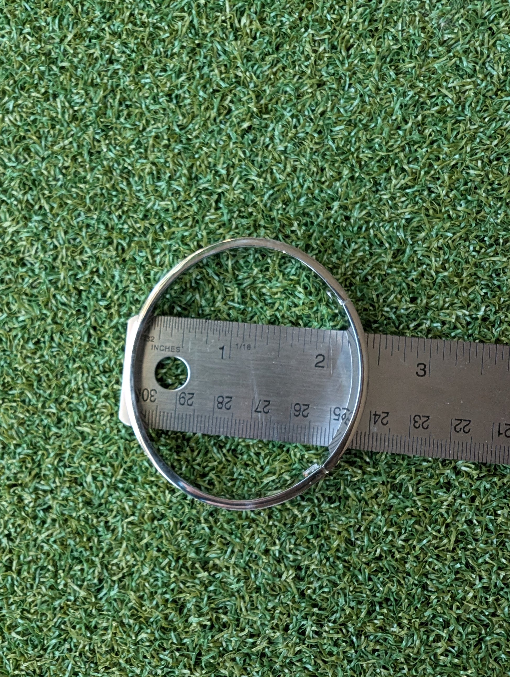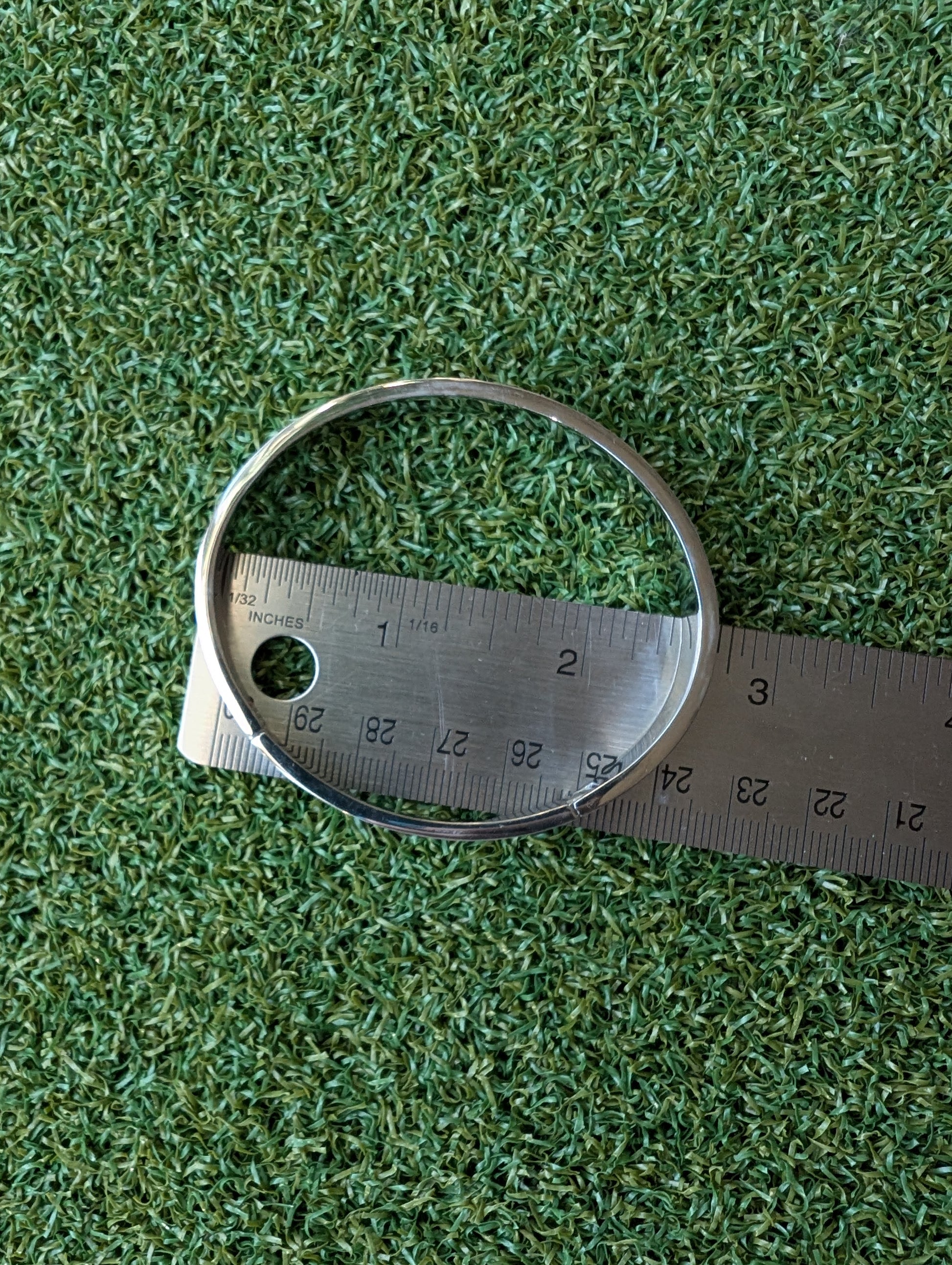 This stainless steel cuff bracelet features and inlay of real baseball glove leather 3/4 around and has a latch clasp. The oval cuff measures about 2.5" x 2.25"