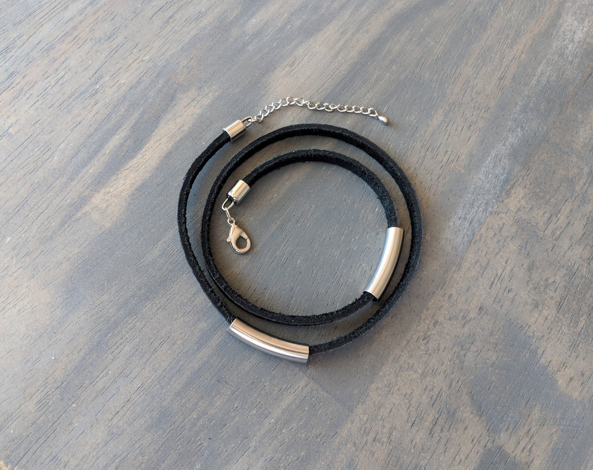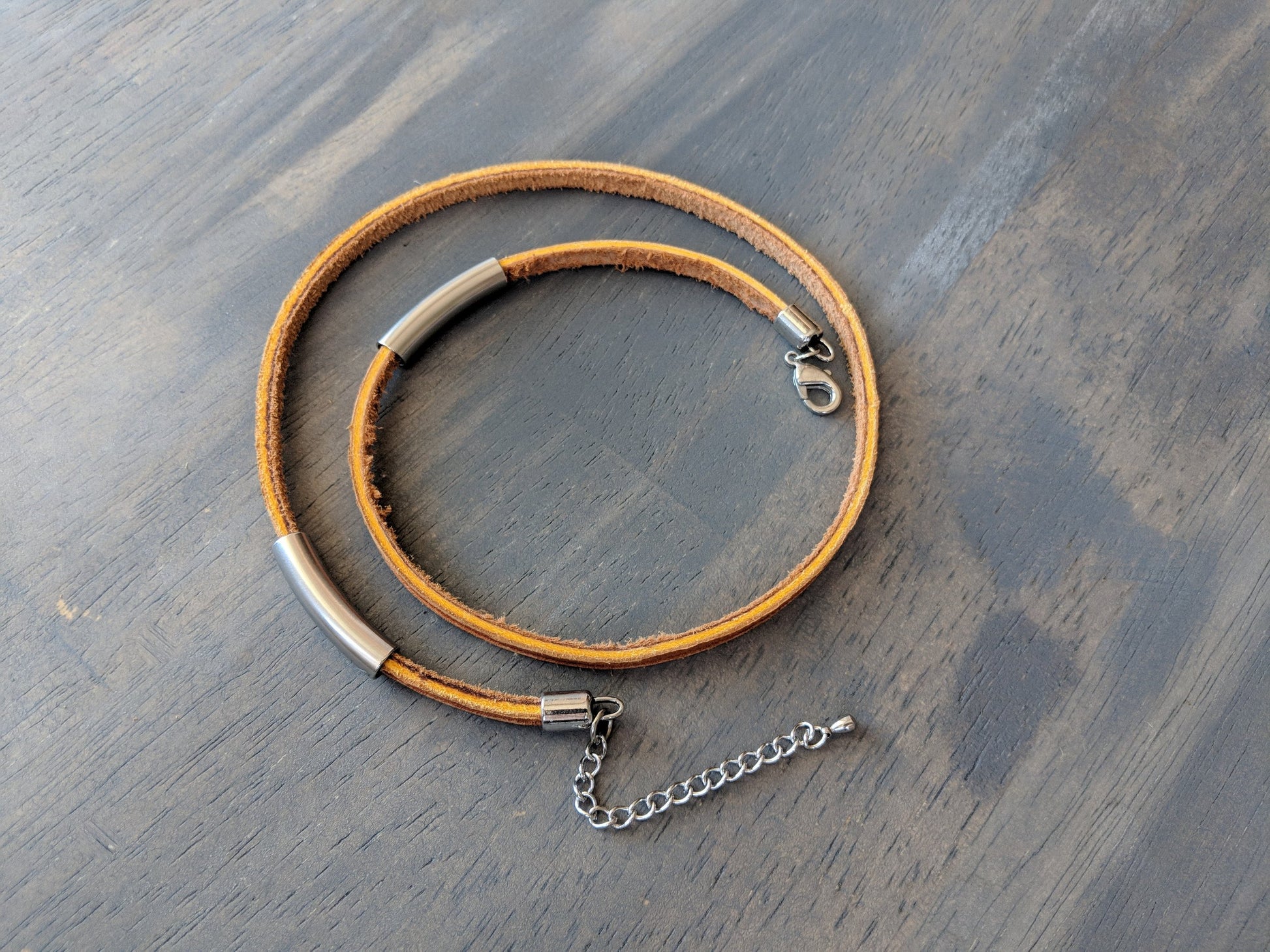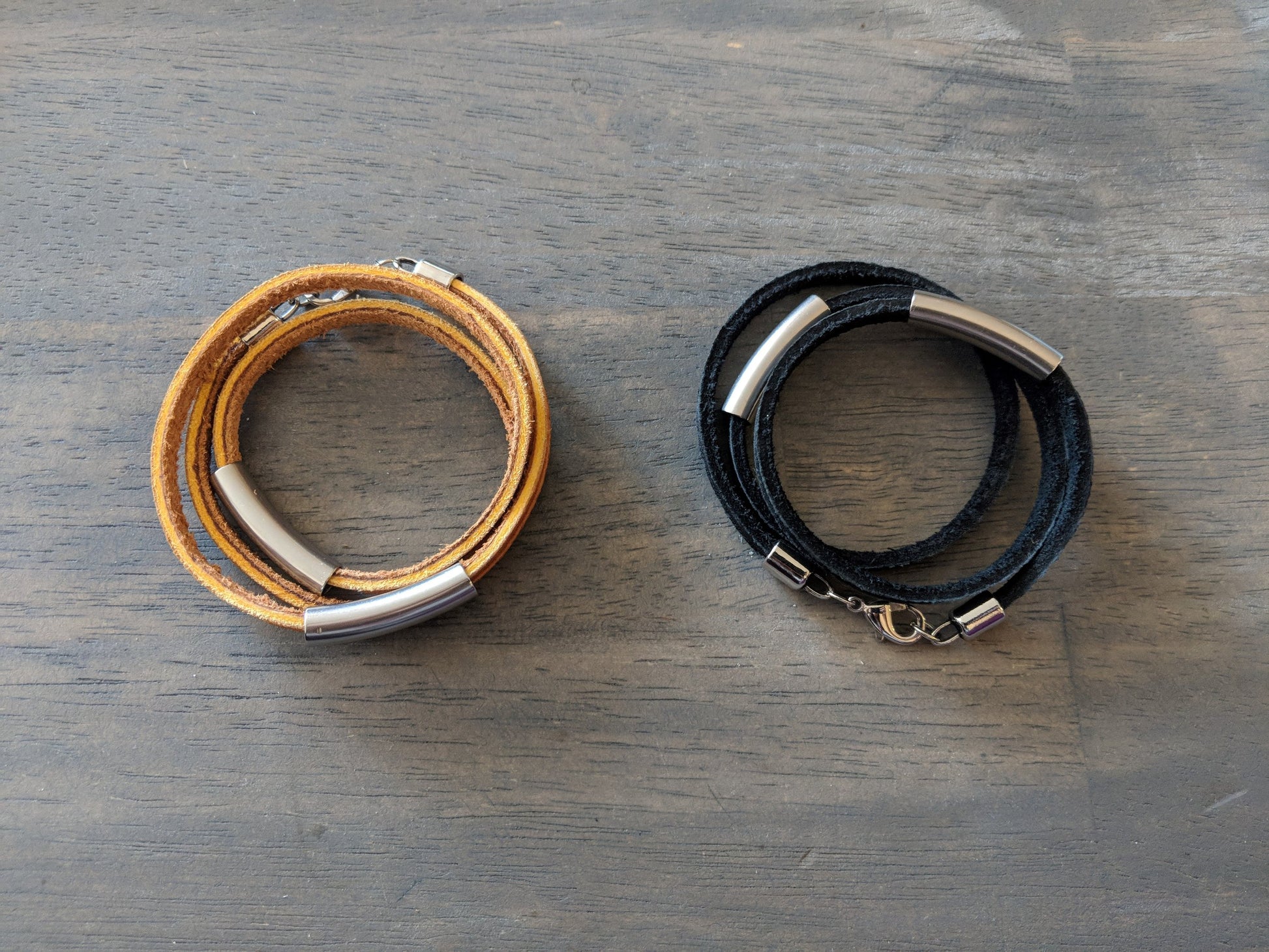 This bracelet is made with a 3/16" wide strip of baseball glove lace that is designed to wrap around the wrist 3 times. The bracelet comes in your choice of black or tan leather and features 2 stainless steel tube beads. The stainless steel chain tail clasp allows you to adjust the bracelet to the size you need.