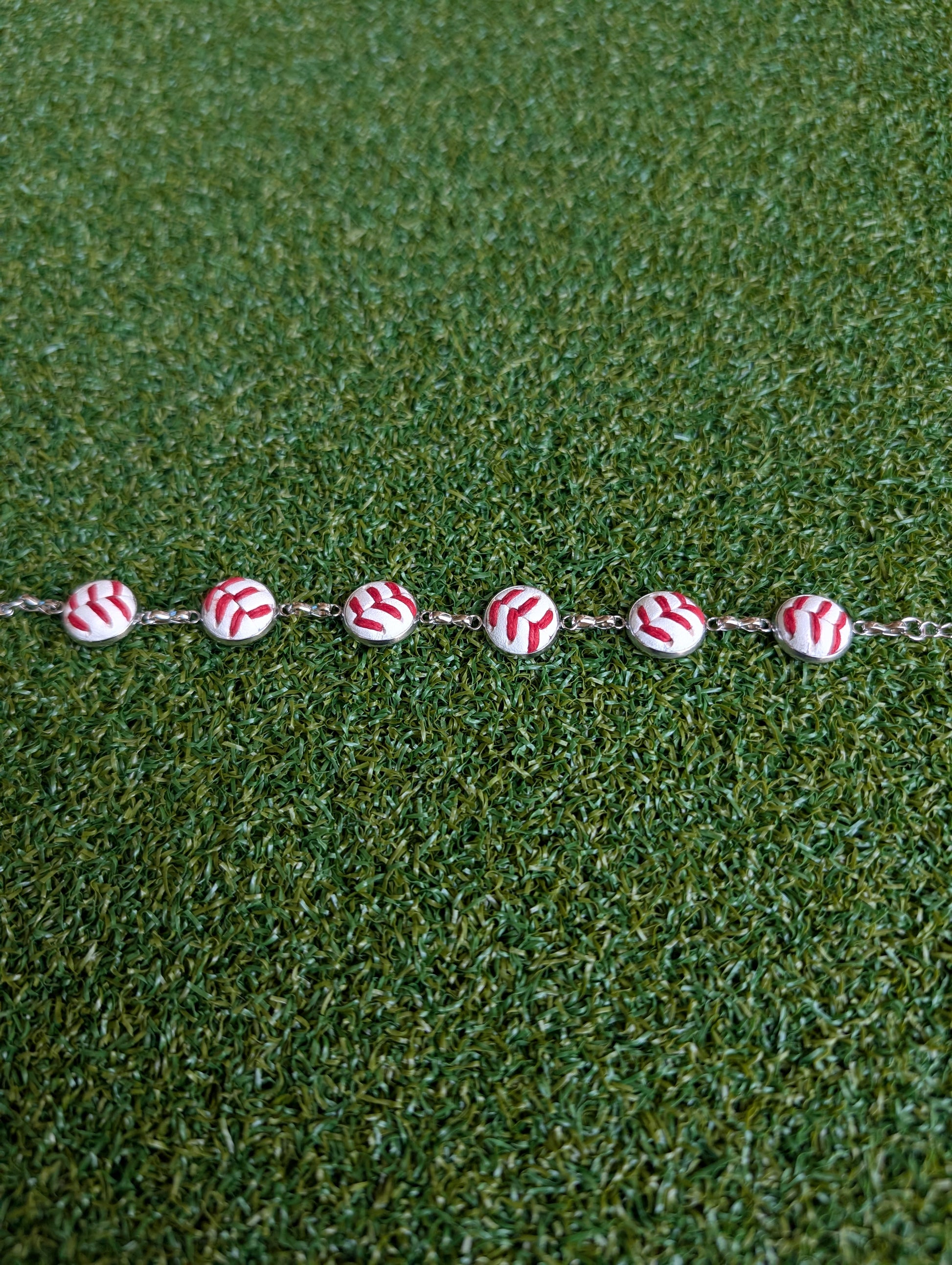 This bracelet has 6 circles inset with real baseball leather. Each 1/2" circle features an open front side so you can feel the leather and a metal back. The length of the bracelet measures 10" and the closure is a chain so you can adjust the bracelet to the perfect length for your wrist. It comes in your choice of silver or gold stainless steel.