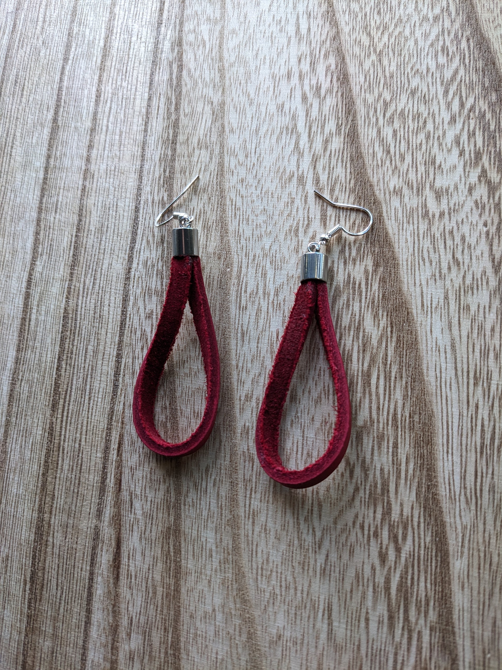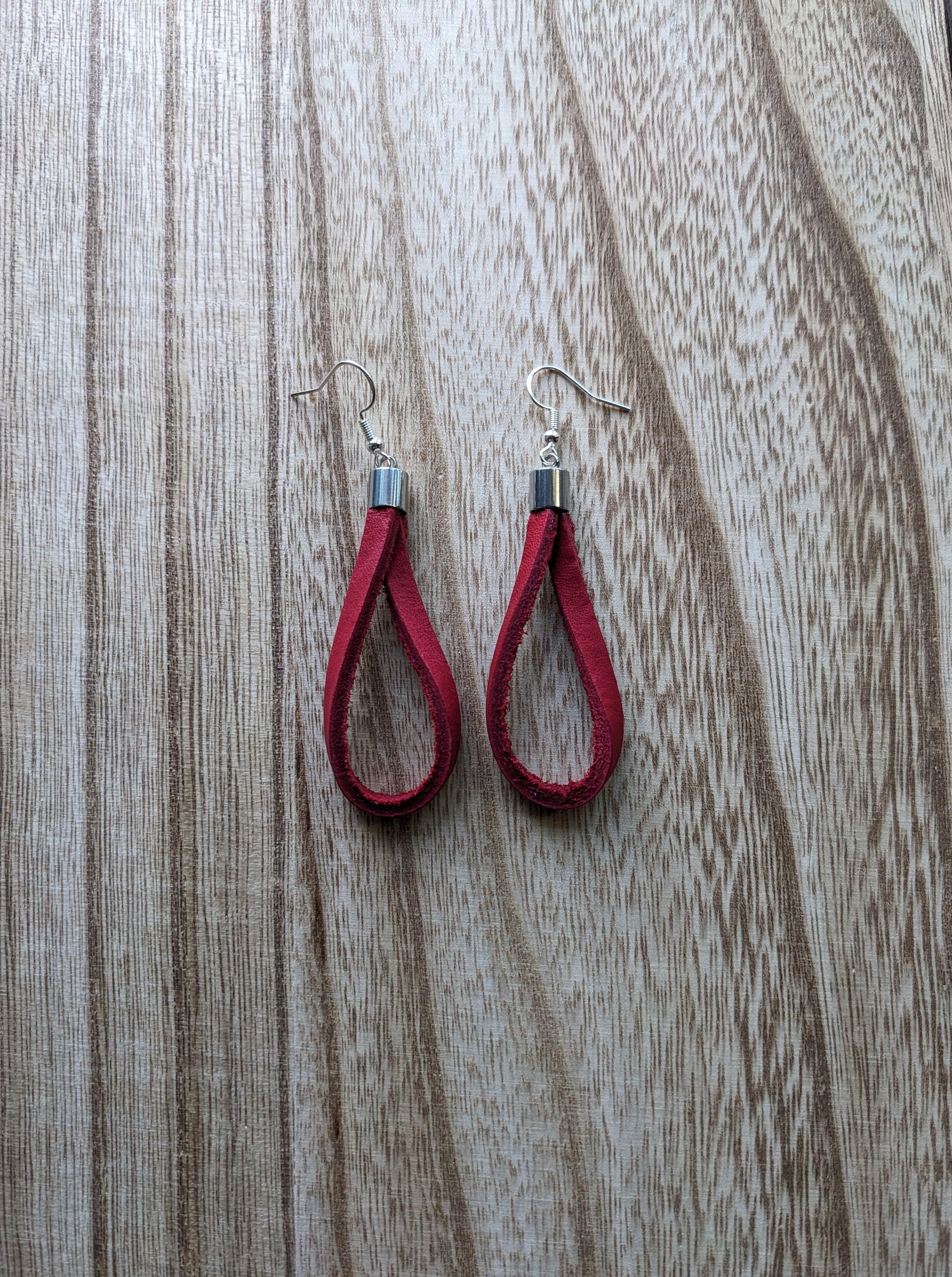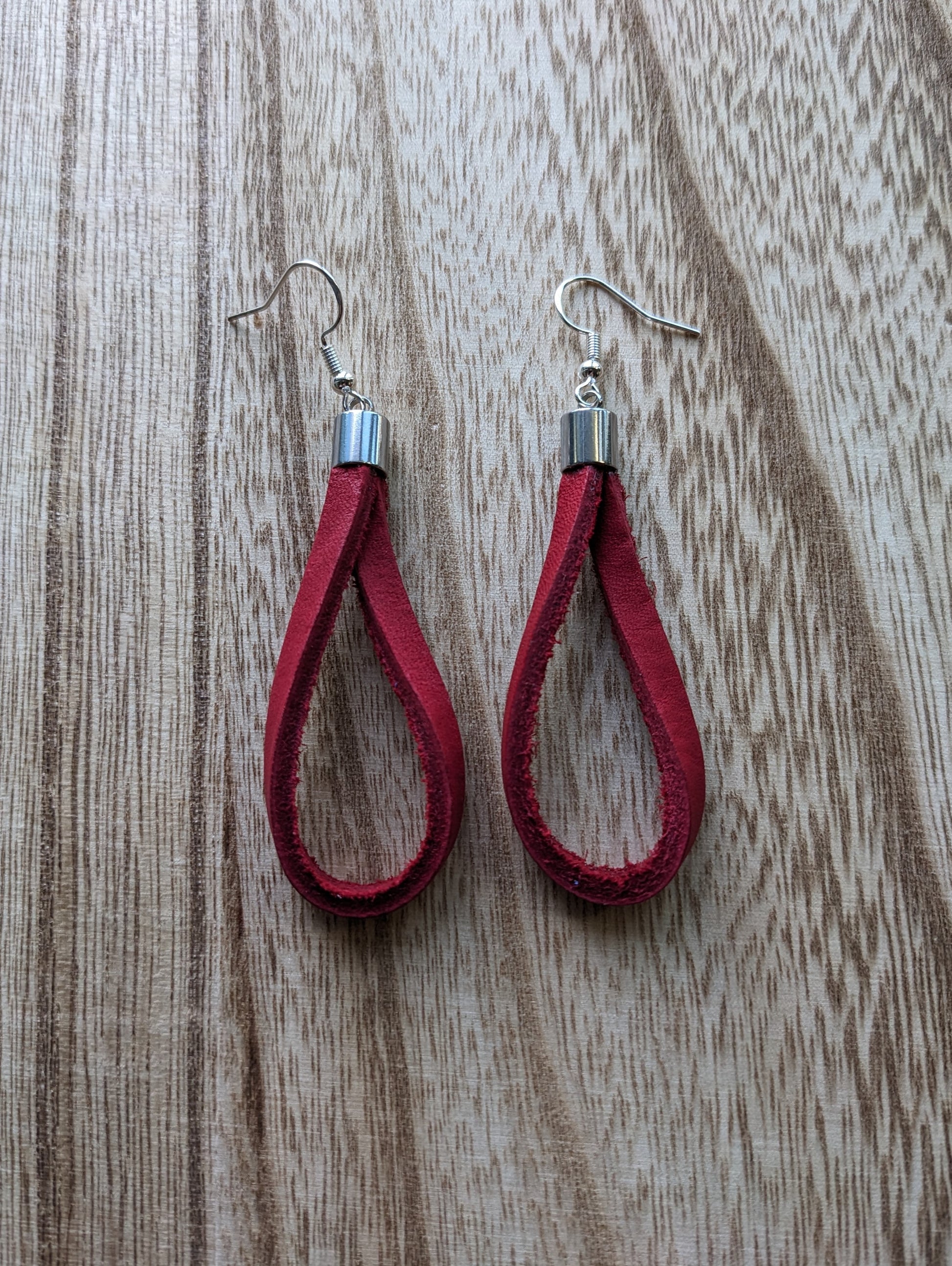 Support your team in these red leather earrings! They are made with 3/16" wide baseball glove lace and measure about 3" in length. The fish hook style ear wires are sterling silver.