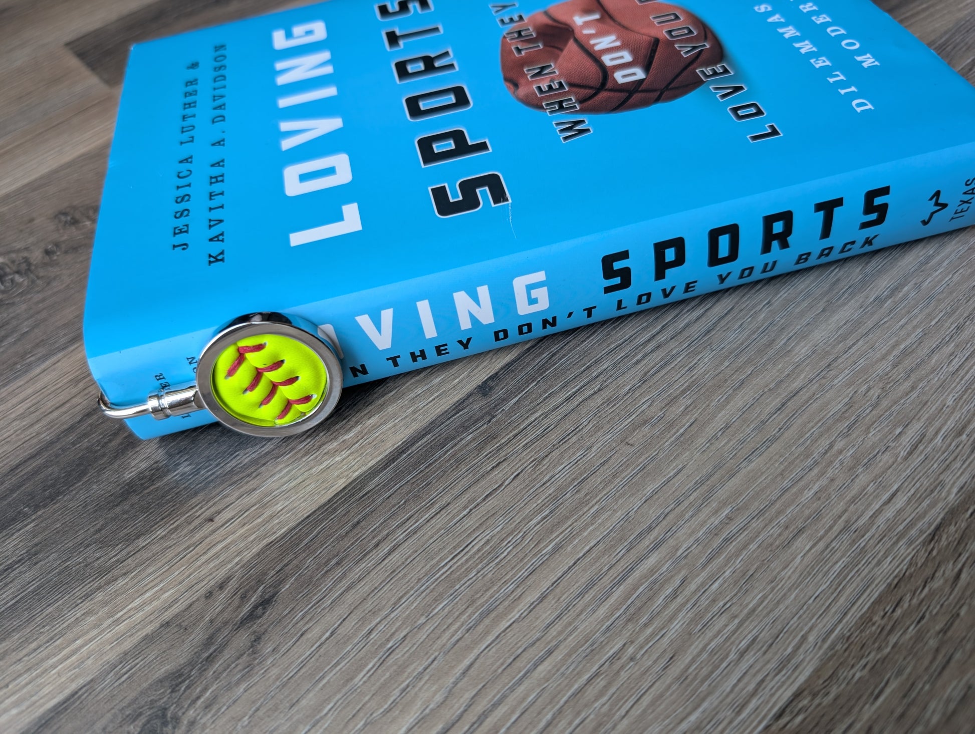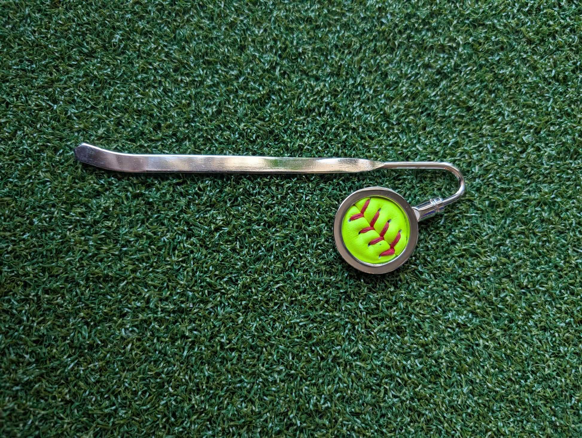 This bookmark/letter opener combo features a circle of leather cut from a real softball. The 7/8” circle of softball leather is left uncovered so you can feel the leather and stitches, and has a solid metal back.