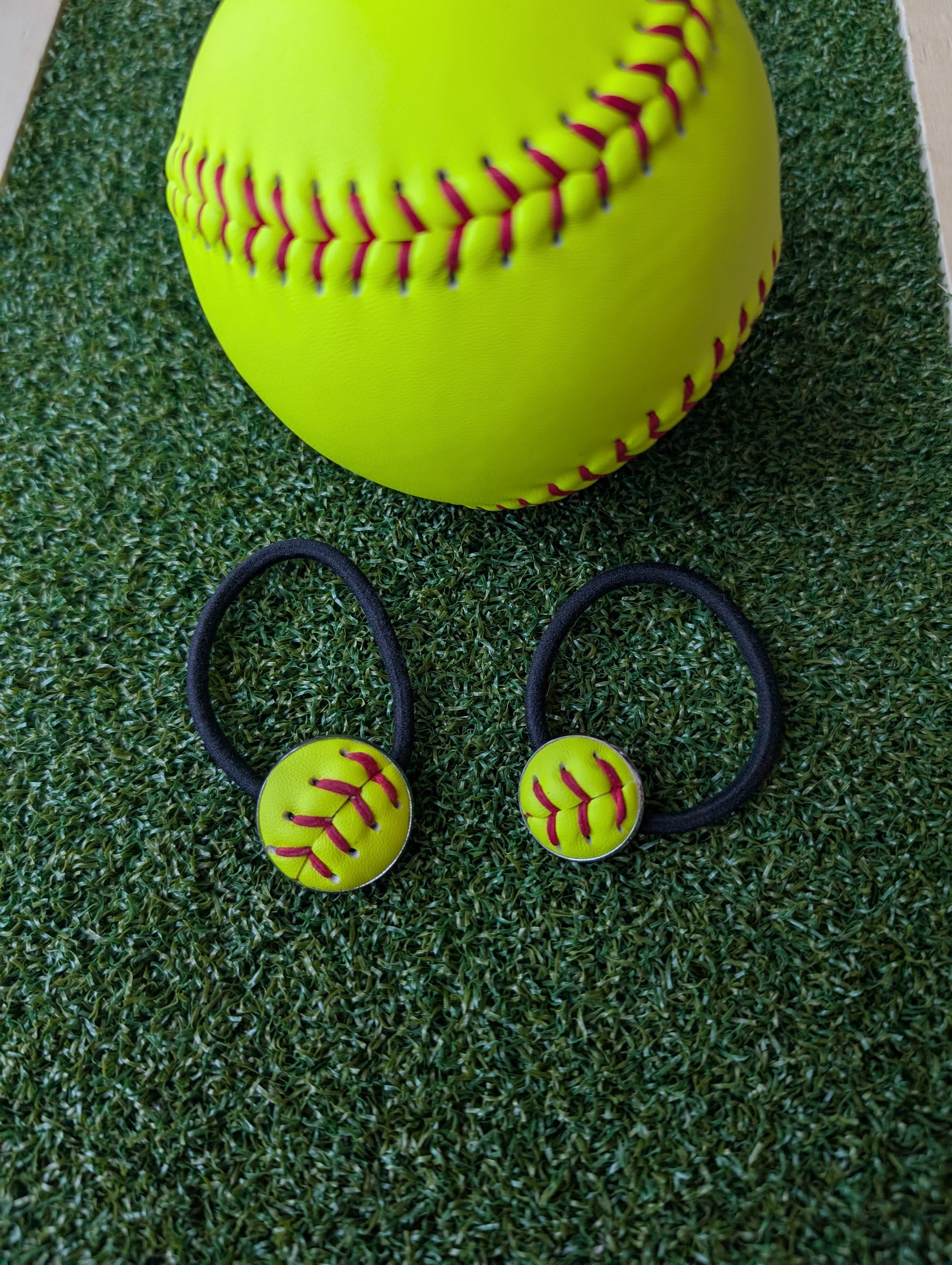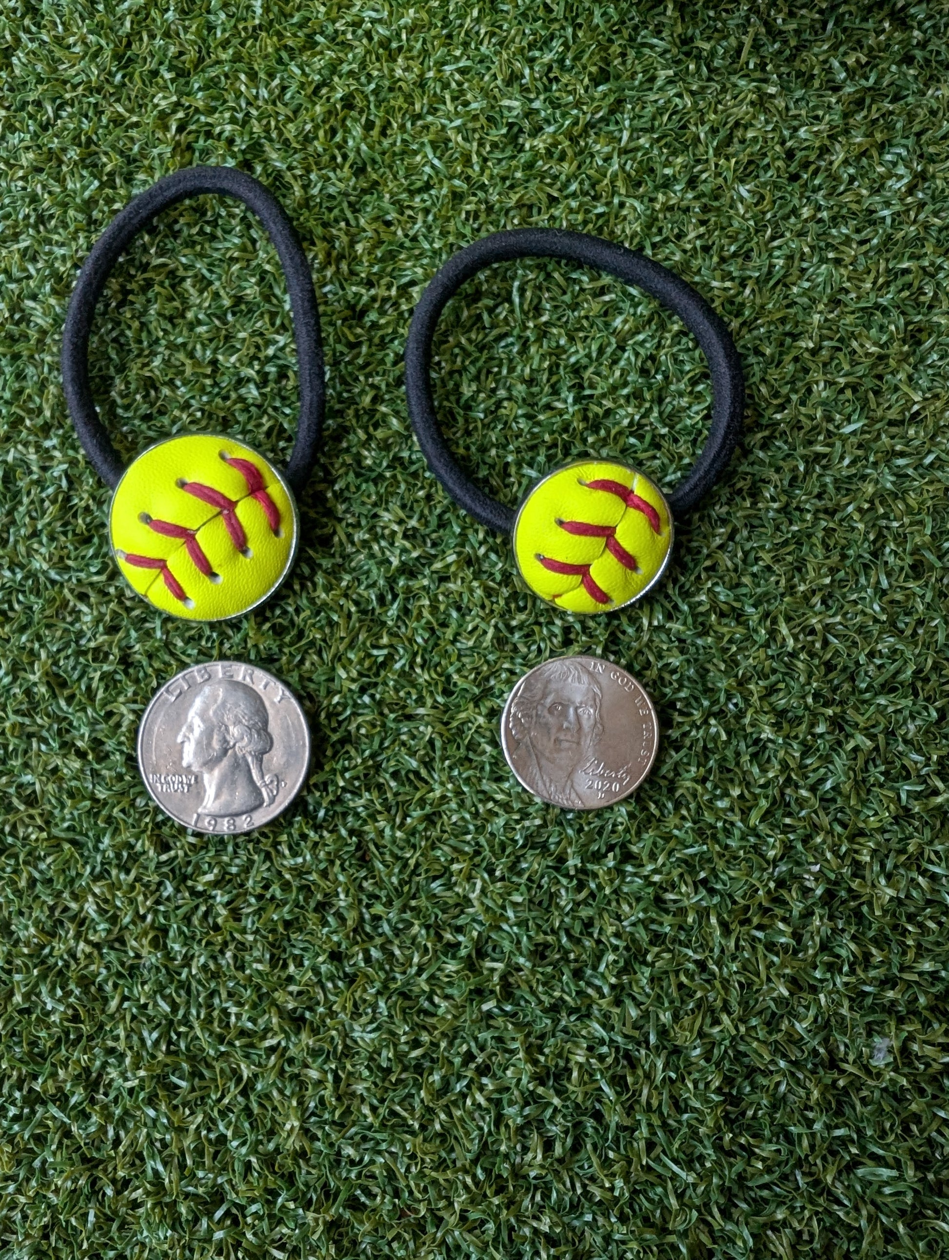 There’s a piece of real softball on this hair tie, in your choice of a 3/4” or 1” circle. The softball is set in a metal bezel attached to a soft durable, slide resistant, elastic hair band.