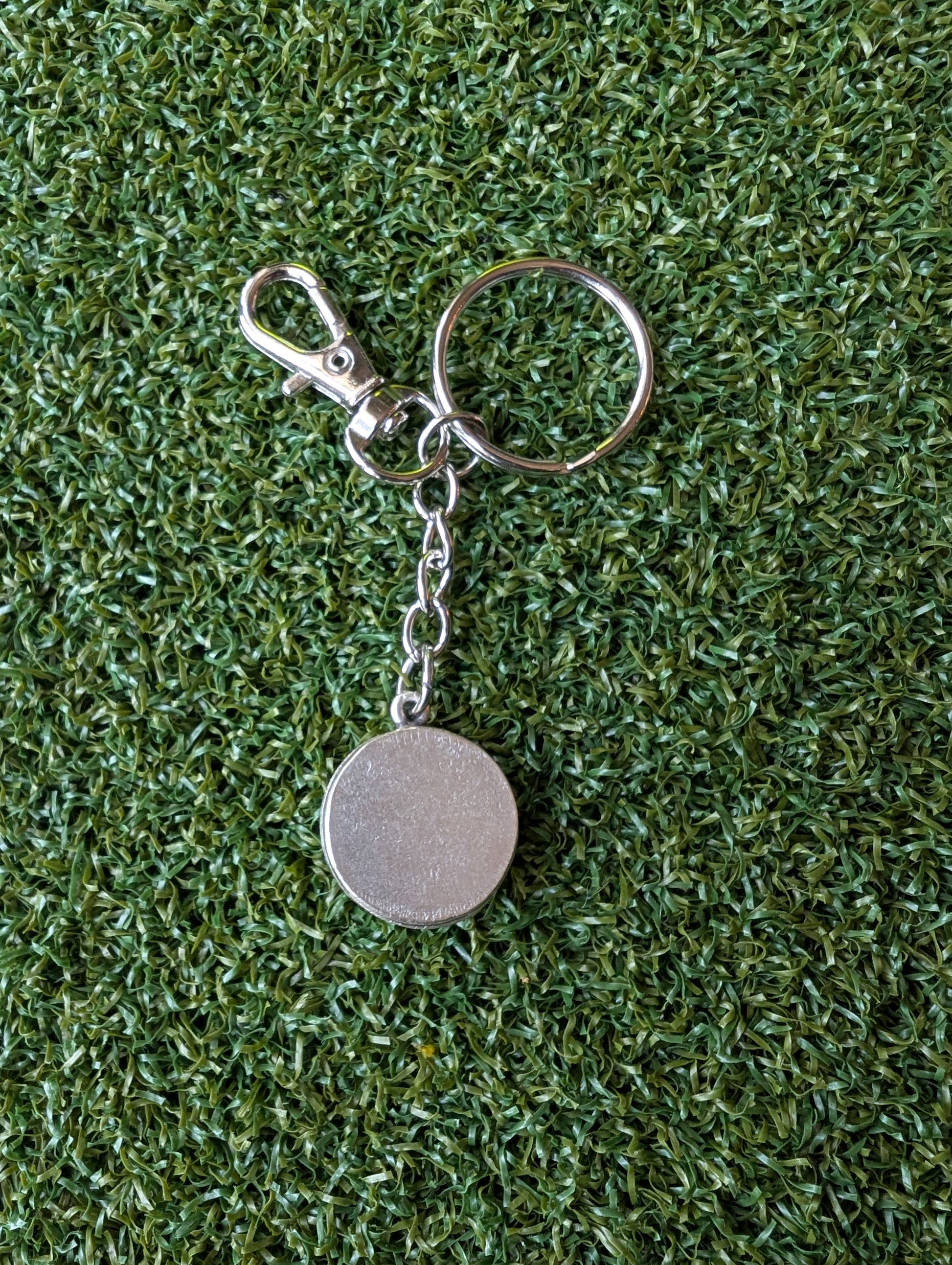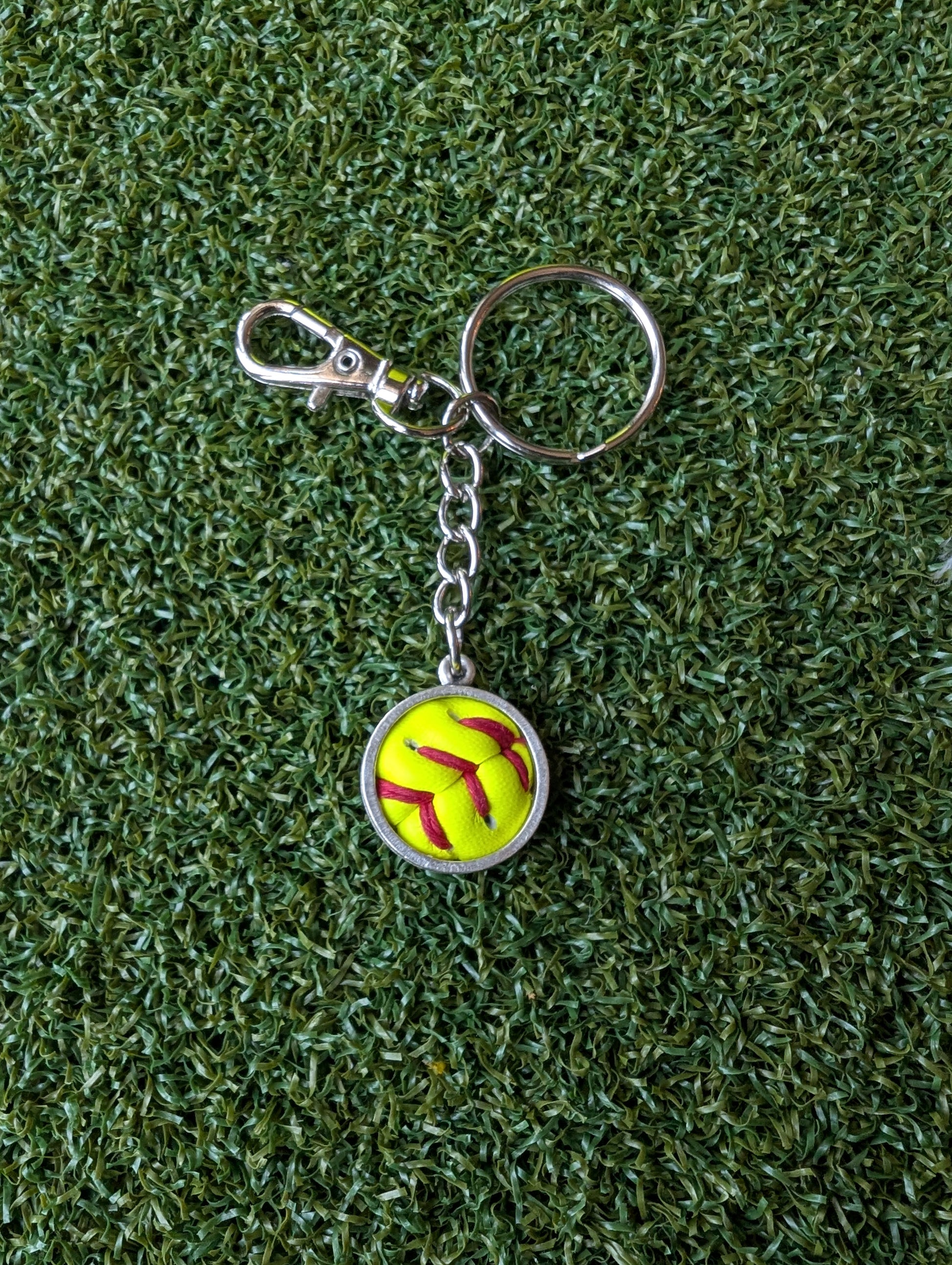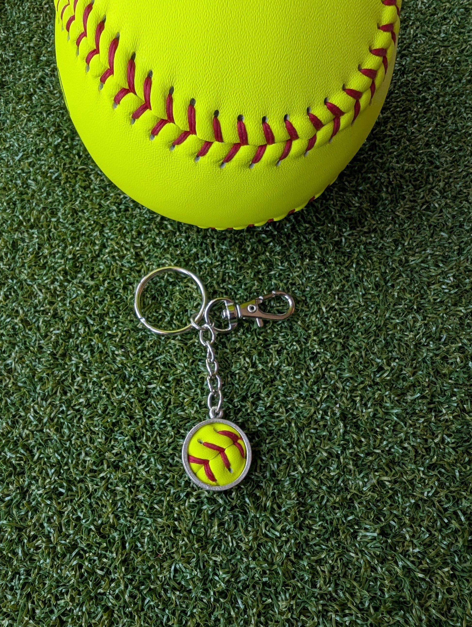 This keychain contains a 3/4" circle of leather cut from a real softball and features an open front side so you can feel the stitches and leather.