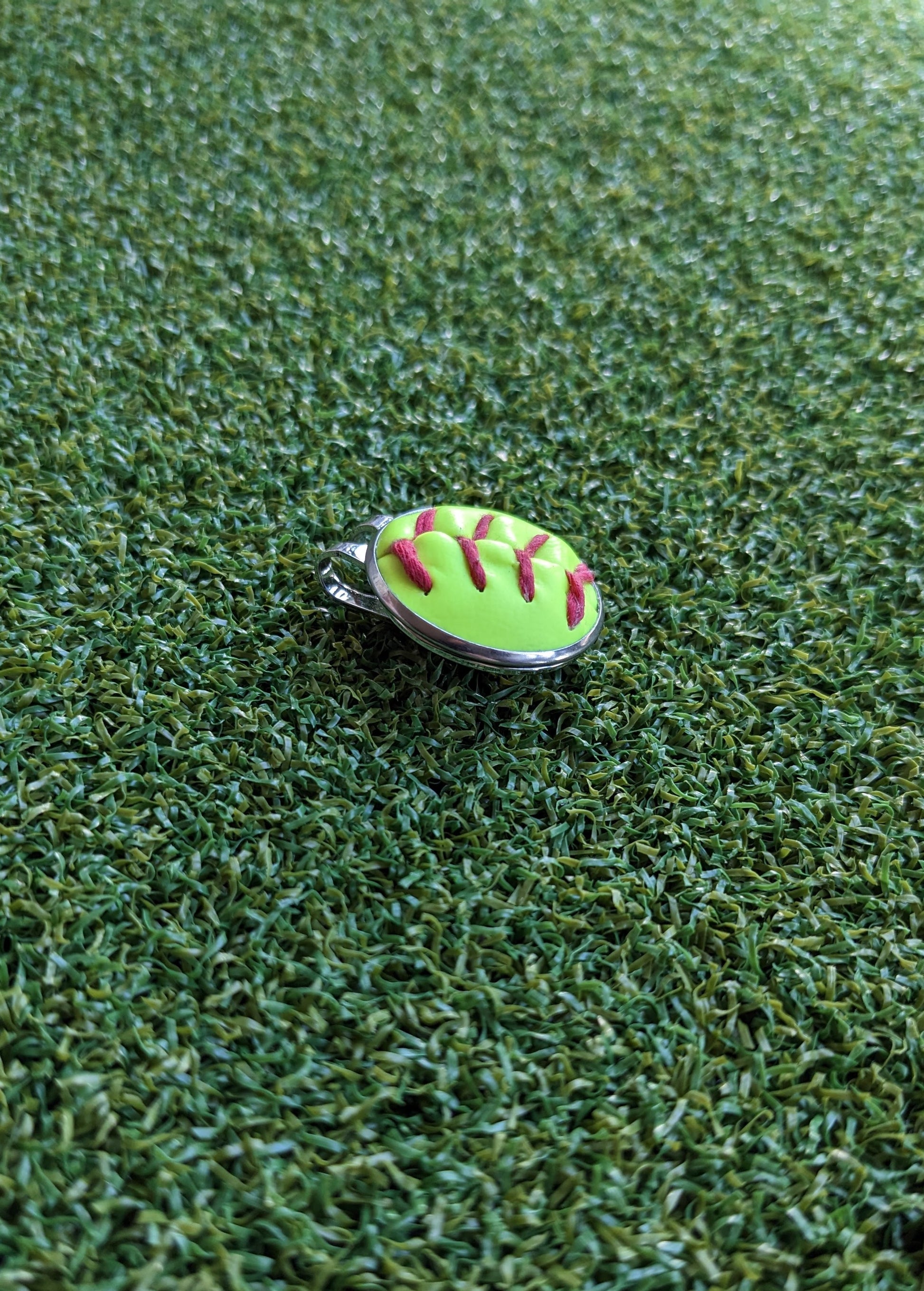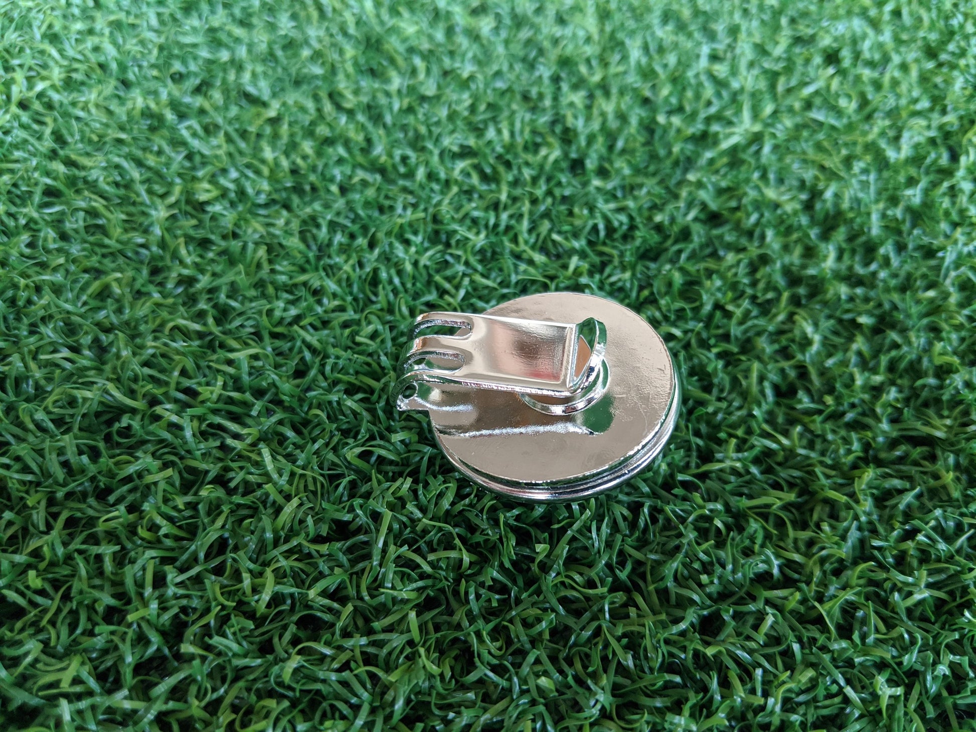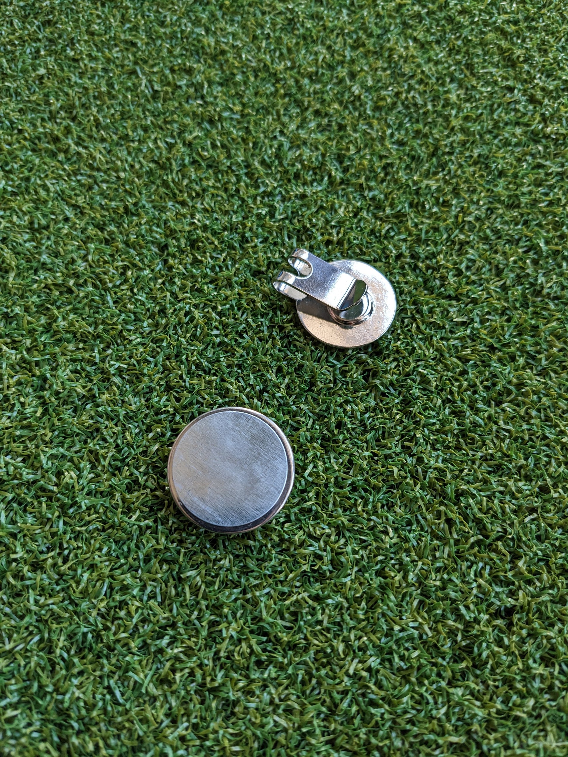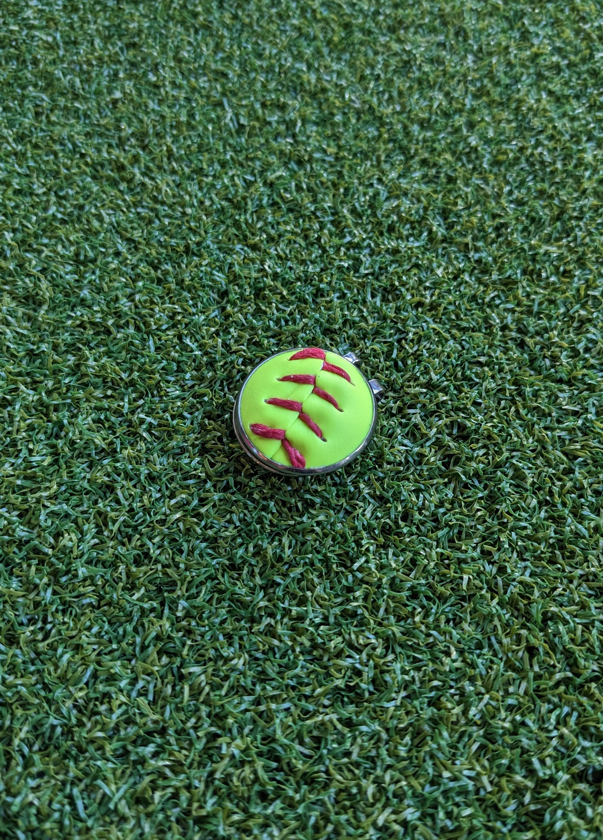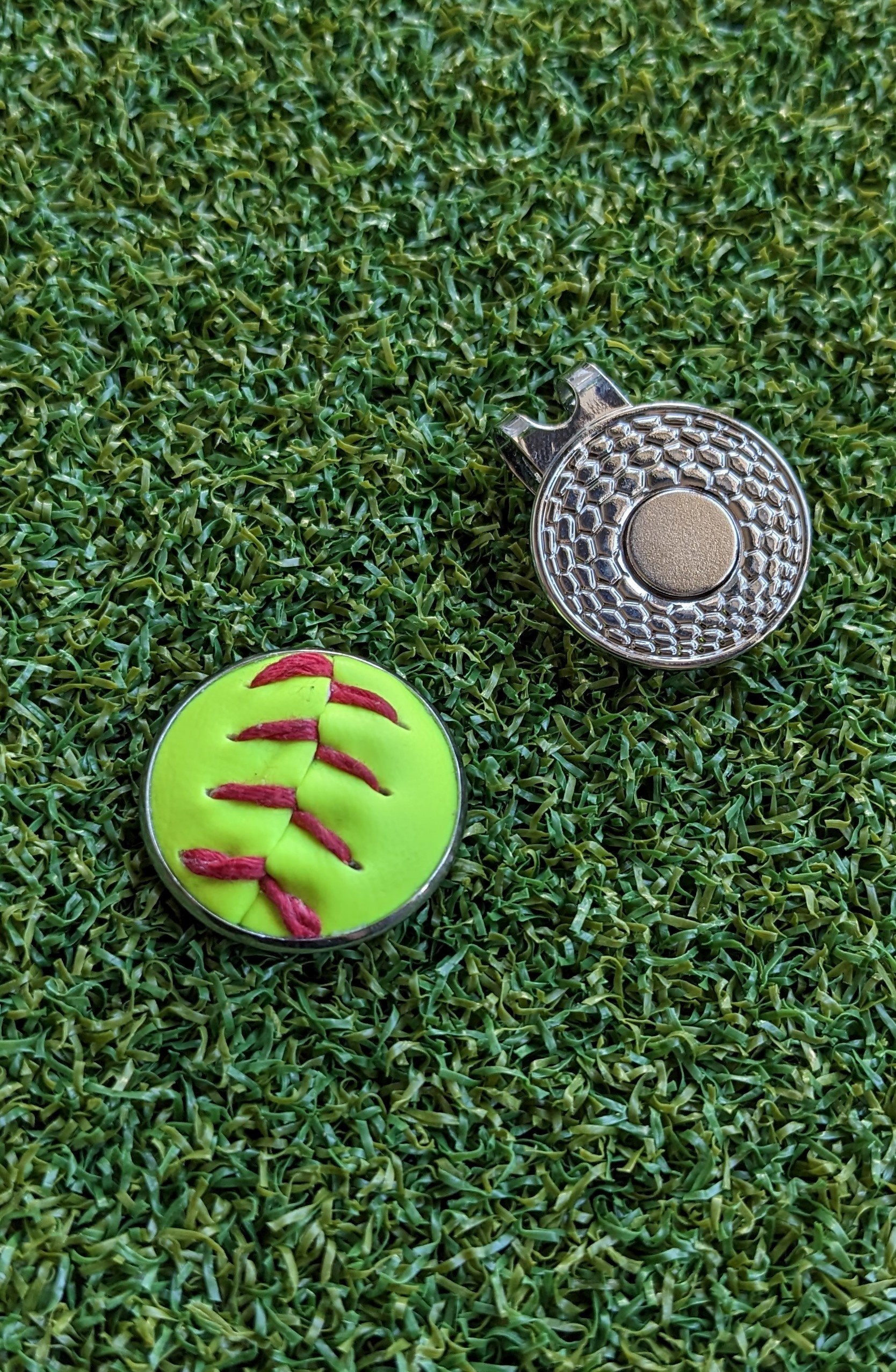 This magnetic golf ball marker features a 1" circle cut from a real softball and a flat metal back. When you're not using it, the strong magnet in the hat clip allows you to easily clip the ball marker on to your hat, or belt, or shirt...