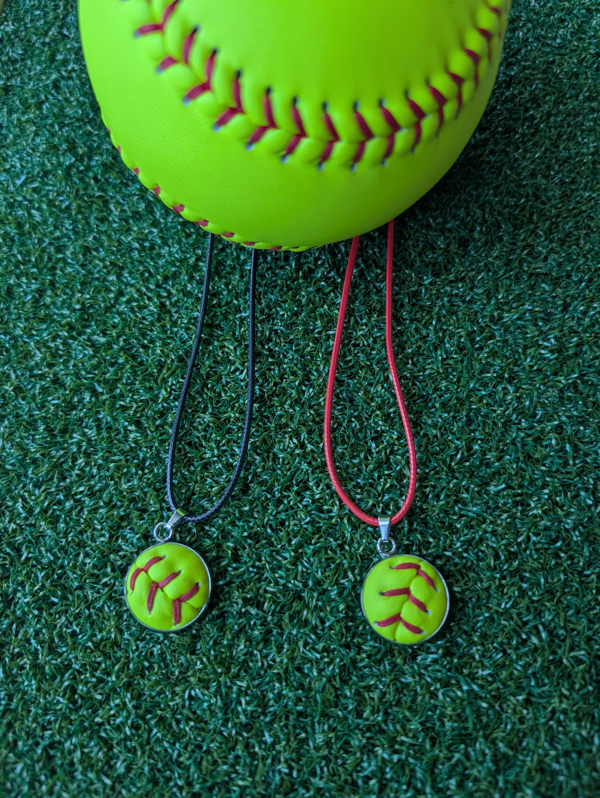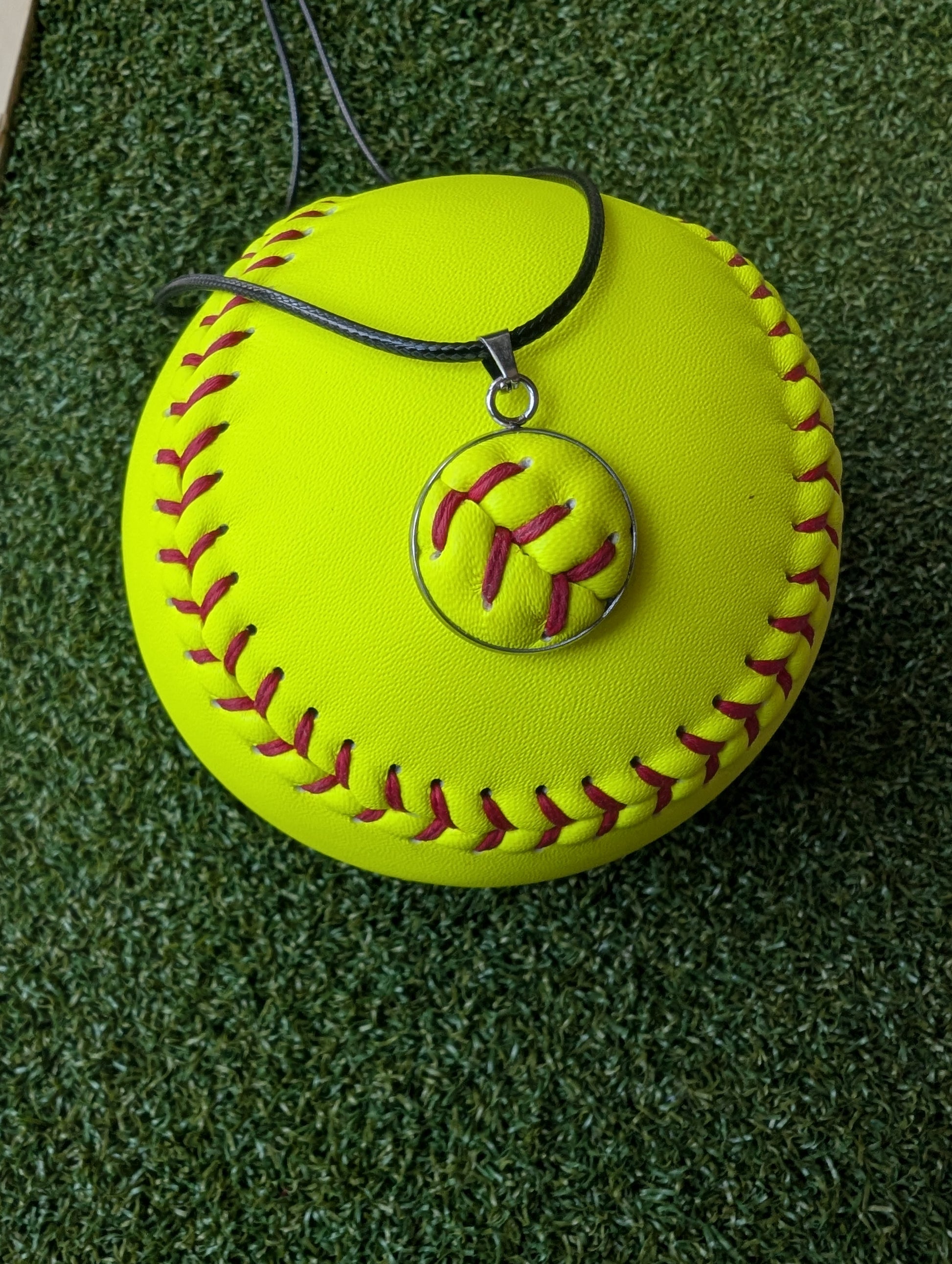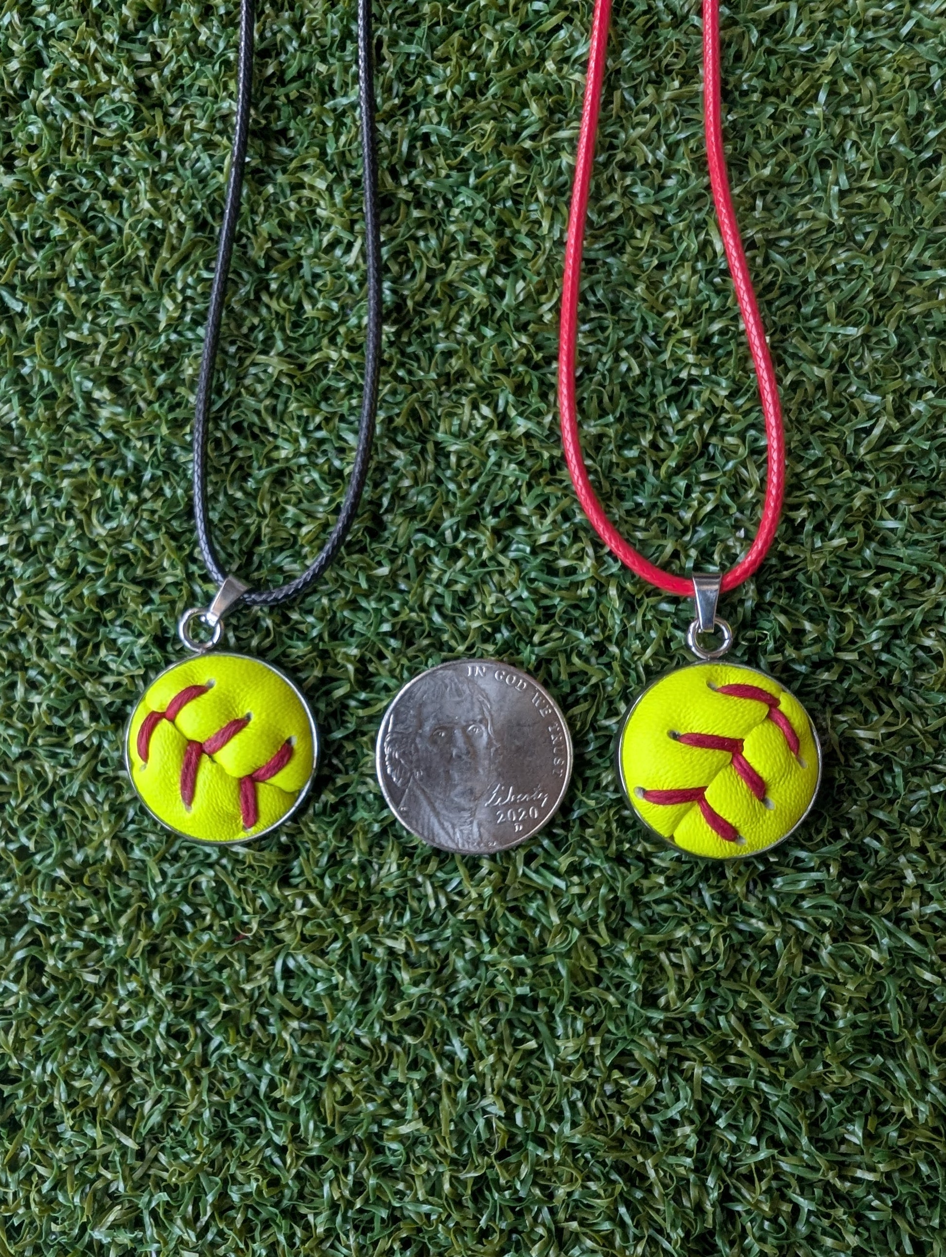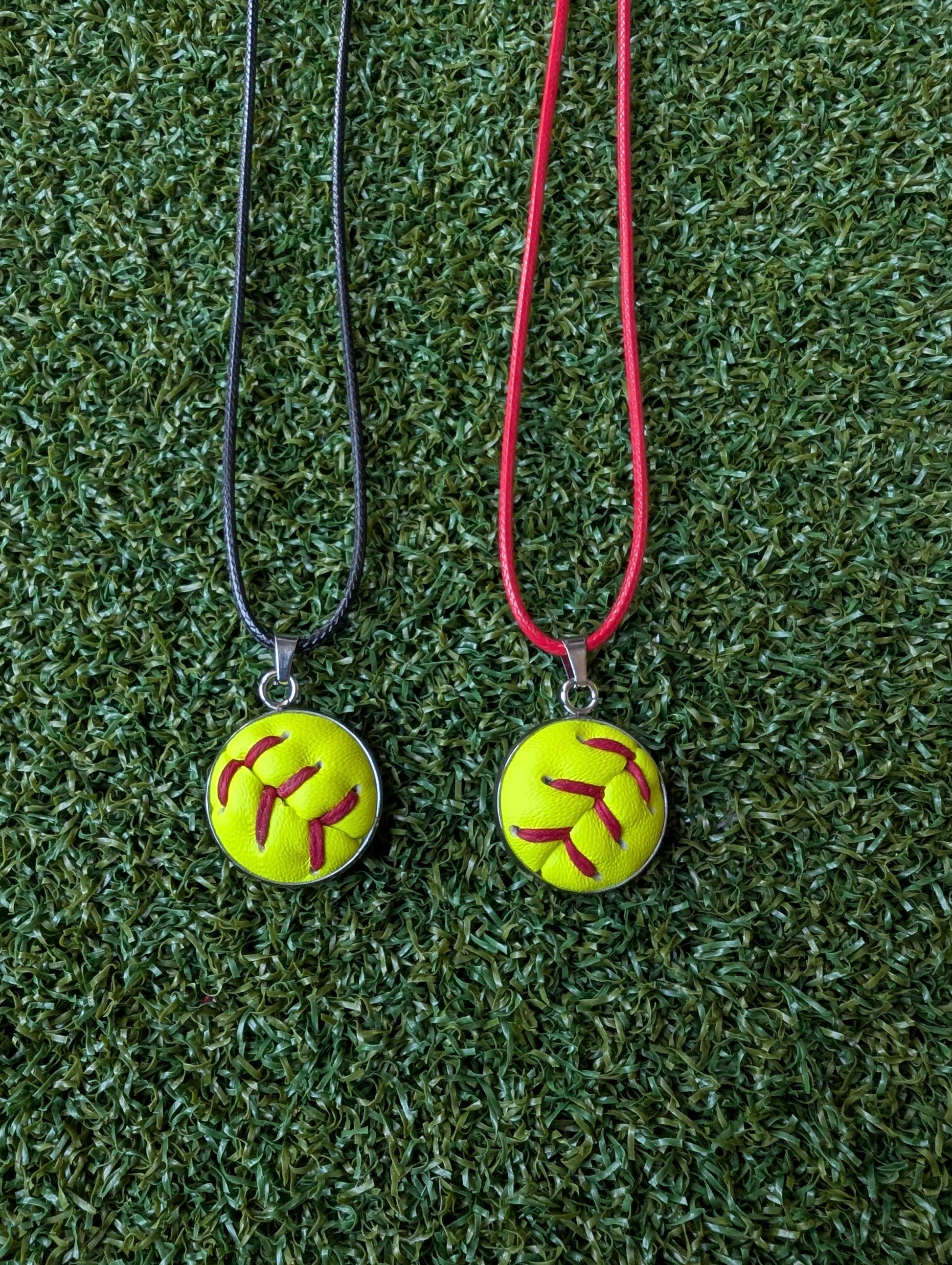 This softball necklace features a 3/4" round stainless steel pendant made with leather cut from a real softball. The pendant has an open front side so you can feel the leather and a solid metal back. The necklace includes a 19" cord in your choice of black or red.